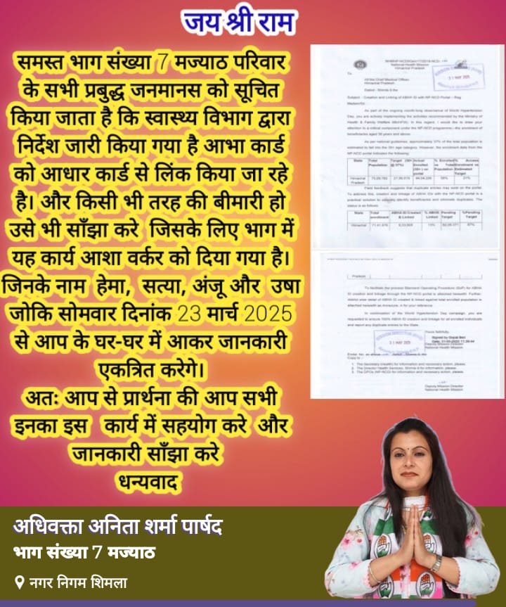 समस्त भाग संख्या 7 मज्याठ परिवार के सभी प्रबुद्ध जनमानस को सूचित किया जाता है कि स्वास्थ्य विभाग द्वारा निर्देश जारी किया गया है आभा कार्ड को आधार कार्ड से लिंक किया जा रहे है। और किसी भी तरह की बीमारी हो उसे भी साँझा करे जिसके लिए भाग में यह कार्य आशा वर्कर को दिया गया है। जिनके नाम हेमा, सत्या, अंजू और उषा जोकि सोमवार दिनांक 23 मार्च 2026 से आप के घर-घर में आकर जानकारी एकत्रित करेगे।