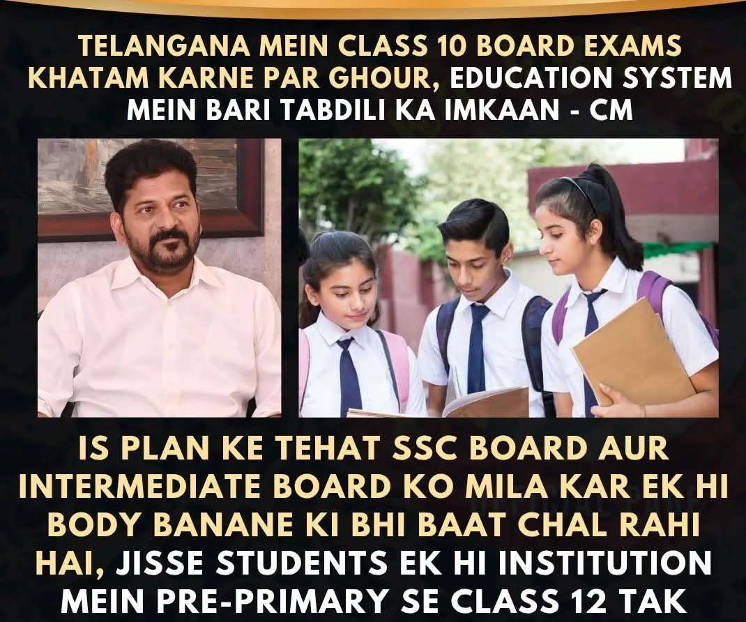 Telangana ke Chief Minister A. Revanth Reddy ne kaha hai ke state government Class 10 ke SSC public exams ko khatam karne par ghour kar rahi hai aur education policy ko National Education Policy 2020 ke mutabiq badalne ki tayari ho rahi hai. Is plan ke tehat SSC Board aur Intermediate Board ko mila kar ek hi body banane ki bhi baat chal rahi hai, jisse students ek hi institution mein pre-primary se Class 12 tak padh sakenge.