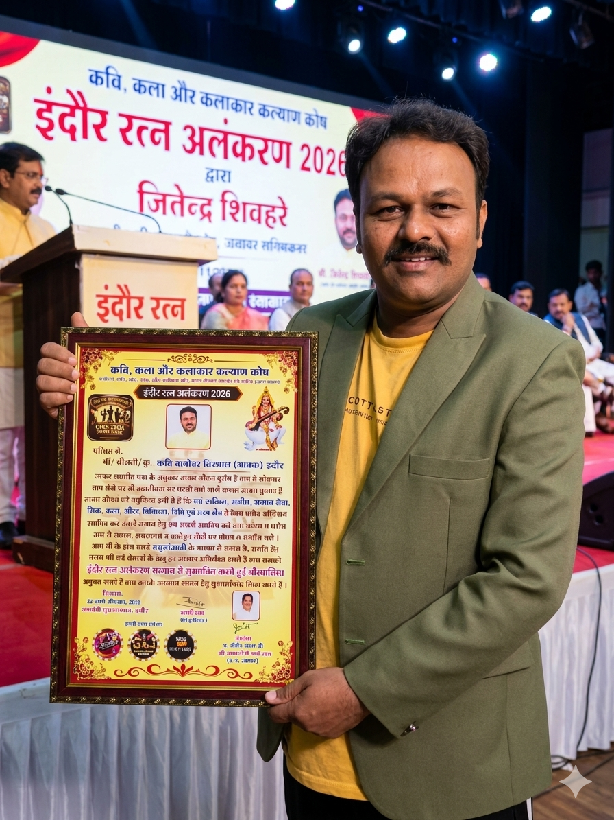 इंदौर | कवि, कला और कल्याण कोष एवं द ओपन स्टेज टेलेंट शो के संस्थापक श्री जितेंद्र शिवहरे के अनूठे प्रयास के अंतर्गत मध्यप्रदेश के विभिन्न क्षेत्रों में सक्रिय 101 विलक्षण प्रतिभाओं को 22 मार्च की शाम को सम्मानित किया गया।