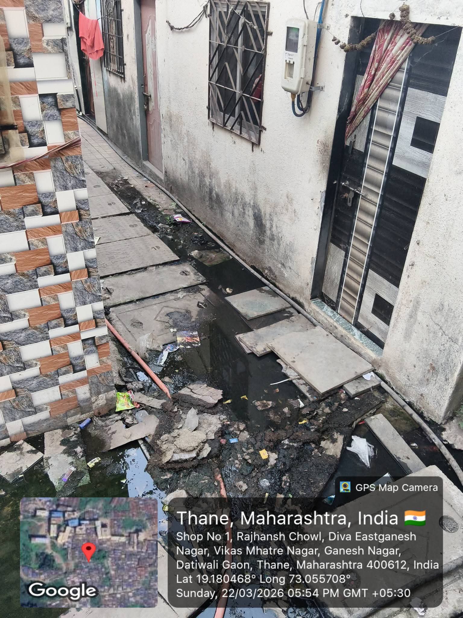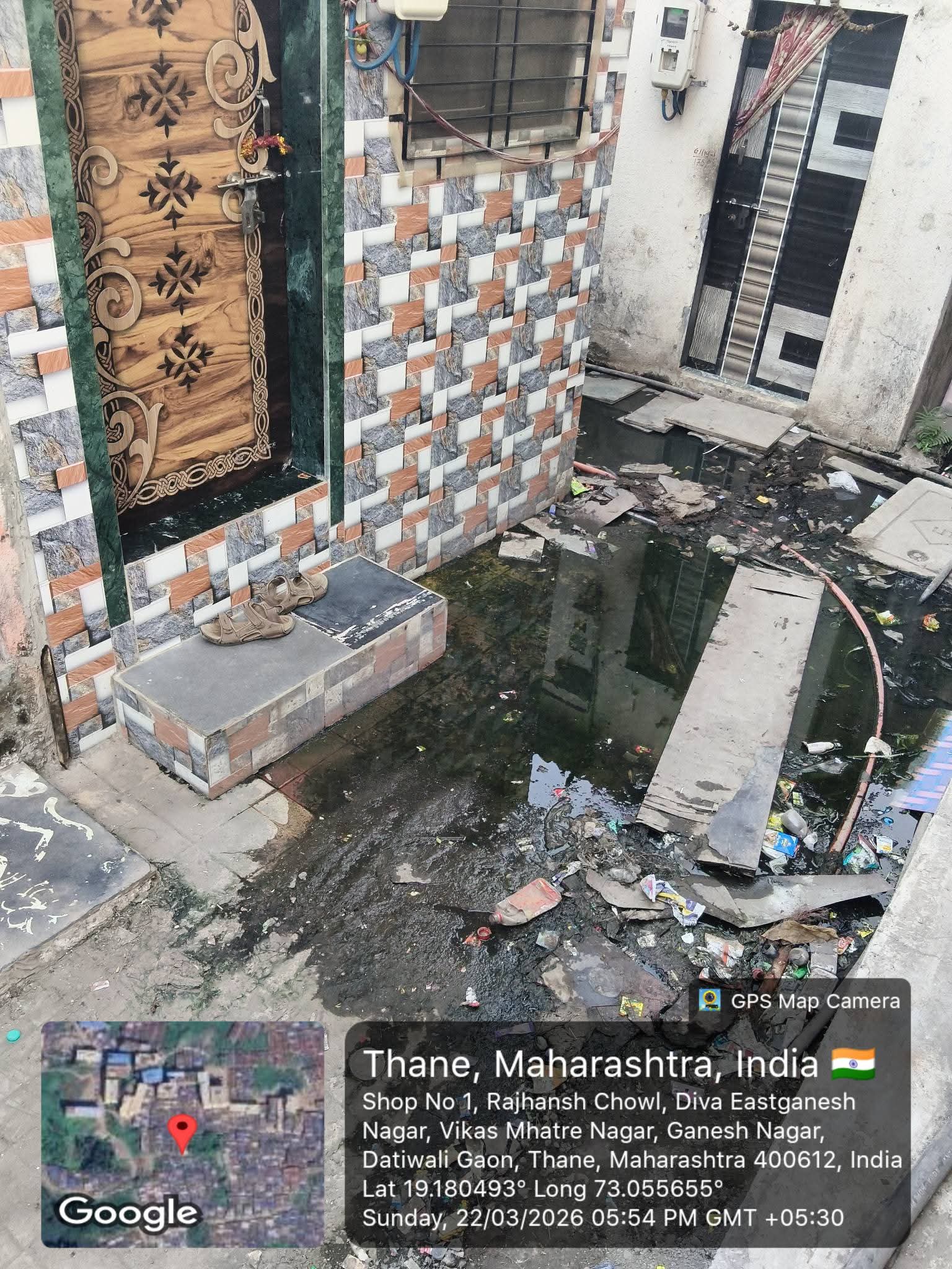 दिवा परिसरातील काळुबाई चाळ/ पार्वती चाळ, म्हात्रे गेट येथे गंभीर आरोग्याचा प्रश्न निर्माण झाला आहे. जागा मालकाने आडवी भिंत उभारल्यामुळे गटार आणि संडासाचे घाण पाणी थेट नागरिकांच्या घरात घुसत असल्याची धक्कादायक परिस्थिती निर्माण झाली आहे.