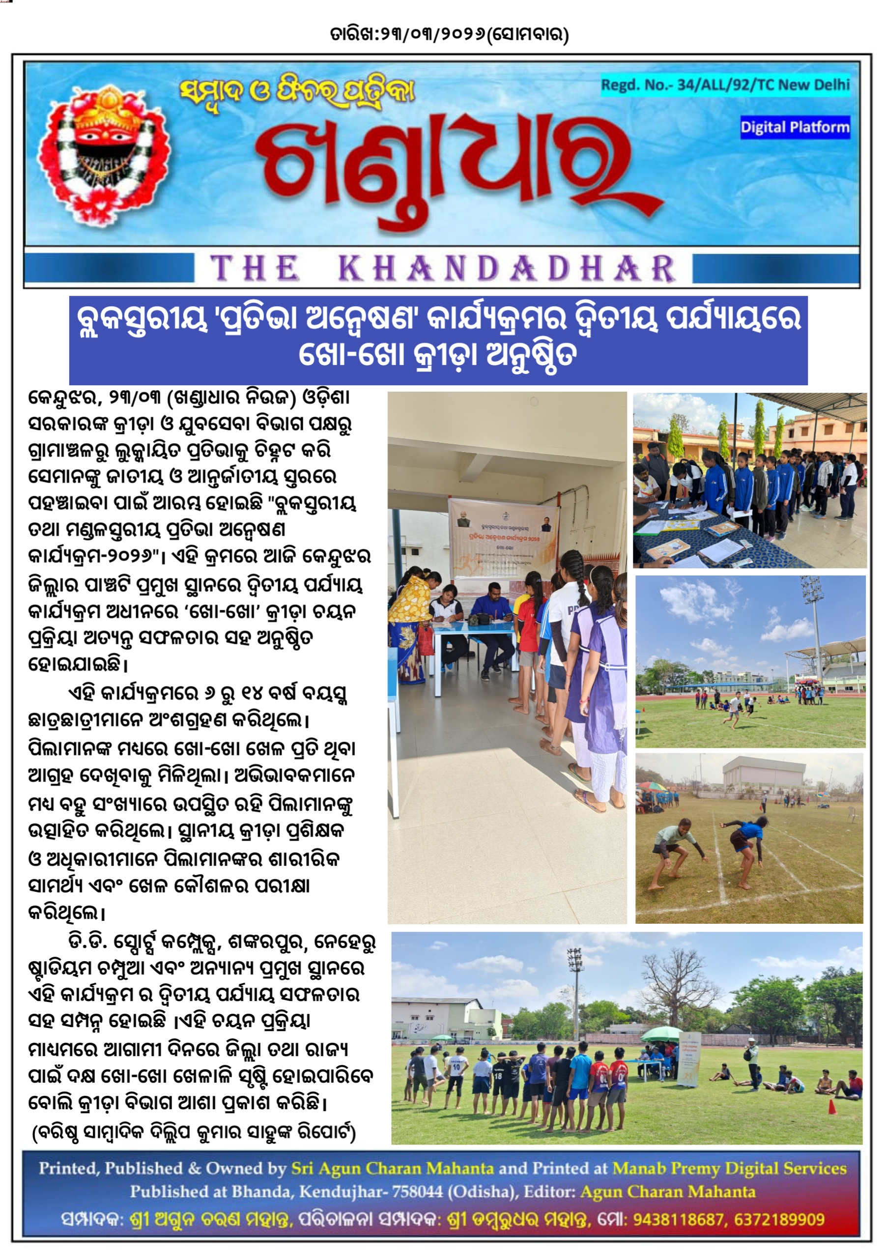 କେନ୍ଦୁଝର, ୨୩/୦୩:ଓଡ଼ିଶା ସରକାରଙ୍କ କ୍ରୀଡ଼ା ଓ ଯୁବସେବା ବିଭାଗ ପକ୍ଷରୁ ଗ୍ରାମାଞ୍ଚଳରୁ ଲୁକ୍କାୟିତ ପ୍ରତିଭାକୁ ଚିହ୍ନଟ କରି ସେମାନଙ୍କୁ ଜାତୀୟ ଓ ଆନ୍ତର୍ଜାତୀୟ ସ୍ତରରେ ପହଞ୍ଚାଇବା ପାଇଁ ଆରମ୍ଭ ହୋଇଛି "ବ୍ଲକସ୍ତରୀୟ ତଥା ମଣ୍ଡଳସ୍ତରୀୟ ପ୍ରତିଭା ଅନ୍ୱେଷଣ କାର୍ଯ୍ୟକ୍ରମ-୨୦୨୬"। ଏହି କ୍ରମରେ ଆଜି କେନ୍ଦୁଝର ଜିଲ୍ଲାର ପାଞ୍ଚଟି ପ୍ରମୁଖ ସ୍ଥାନରେ ଦ୍ଵିତୀୟ ପର୍ଯ୍ୟାୟ କାର୍ଯ୍ୟକ୍ରମ ଅଧୀନରେ ‘ଖୋ-ଖୋ’ କ୍ରୀଡ଼ା ଚୟନ ପ୍ରକ୍ରିୟା ଅତ୍ୟନ୍ତ ସଫଳତାର ସହ ଅନୁଷ୍ଠିତ ହୋଇଯାଇଛି।