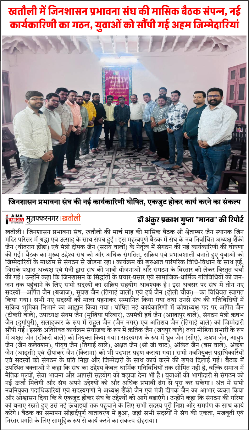 खतौली में जिनशासन प्रभावना संघ की मासिक बैठक संपन्न, नई कार्यकारिणी का गठन, युवाओं को सौंपी गई अहम जिम्मेदारियां