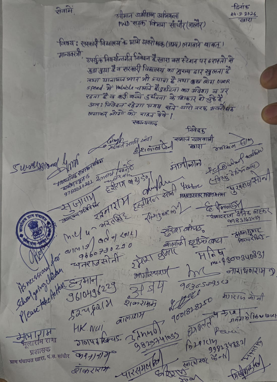 # खारा (सांचोर) के स्थानीय लोगो द्वारा खारा में स्थित आदर्श राजकीय उच्च माध्यमिक विद्यालय के आगे जम्प ( अवरोधक ) निर्माण को लेकर PWD सांचोर व स्थानीय ग्राम प्रशासन को पत्र लिख कर जम्प निर्माण हेतु आग्रह किया | लोगो का कहना है कि जालोर - सांचोर वाया भीनमाल , करड़ा मुख्य सड़क होने से व्हीकल तेज रफ़्तार से चलते है तथा सरकारी विद्यालय के आगे से मुख्य सड़क निकलने से हादसे का डर हर समय रहता है, इस मामले को लेकर स्थानीय लोगो ने जम्प निर्माण हेतु ग्राम पंचायत और PWD के नाम पत्र लिखा | स्थानीय ग्राम के VDO श्री भजन लाल विश्नोई को पत्र के माध्यम से जम्प निर्माण के लिए आग्रह किया | मौके पर श्री देवीलाल सोनी, गणपत सिंह भादू, उत्तम सिंह (रोजगार सहायक), मोहनजी कुराड़ा, दुर्गा राम, अशोक जी कुराड़ा, रेवाराम सहित अन्य ग्रामीण भी मौजूद रहे |