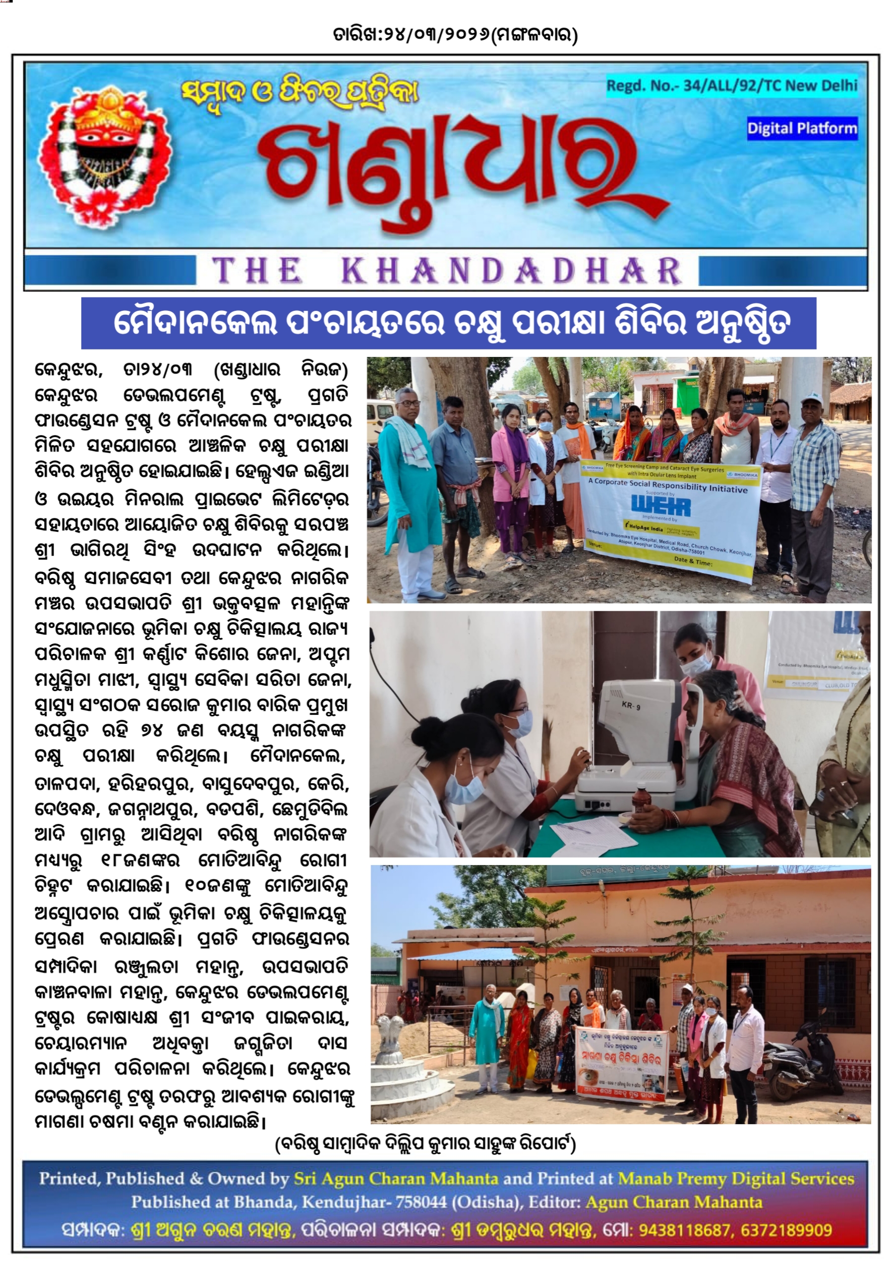 କେନ୍ଦୁଝର,ତା୨୪/୩- କେନ୍ଦୁଝର ଡେଭଲପମେଣ୍ଟ ଟ୍ରଷ୍ଟ, ପ୍ରଗତି ଫାଉଣ୍ଡେସନ ଟ୍ରଷ୍ଟ ଓ ମୈଦାନକେଲ ପଂଚାୟତର ମିଳିତ ସହଯୋଗରେ ଆଞ୍ଚଳିକ ଚକ୍ଷୁ ପରୀକ୍ଷା ଶିବିର ଅନୁଷ୍ଠିତ ହୋଇଯାଇଛି। ହେଲ୍ପଏଜ ଇଣ୍ଡିଆ ଓ ଉଇୟର ମିନରାଲ ପ୍ରାଇଭେଟ ଲିମିଟେଡ଼ର ସହାୟତାରେ ଆୟୋଜିତ ଚକ୍ଷୁ ଶିବିରକୁ ସରପଞ୍ଚ ଶ୍ରୀ ଭାଗିରଥି ସିଂହ ଉଦଘାଟନ କରିଥିଲେ। ବରିଷ୍ଠ ସମାଜସେବୀ ତଥା କେନ୍ଦୁଝର ନାଗରିକ ମଞ୍ଚର ଉପସଭାପତି ଶ୍ରୀ ଭକ୍ତବତ୍ସଳ ମହାନ୍ତିଙ୍କ ସଂଯୋଜନାରେ ଭୂମିକା ଚକ୍ଷୁ ଚିକିତ୍ସାଲୟ ରାଜ୍ୟ ପରିଚାଳକ ଶ୍ରୀ କର୍ଣ୍ଣାଟ କିଶୋର ଜେନା, ଅପ୍ଟମ ମଧୁସ୍ମିତା ମାଝୀ, ସ୍ୱାସ୍ଥ୍ୟ ସେବିକା ସରିତା ଜେନା, ସ୍ୱାସ୍ଥ୍ୟ ସଂଗଠକ ସରୋଜ କୁମାର ବାରିକ ପ୍ରମୁଖ ଉପସ୍ଥିତ ରହି ୭୪ ଜଣ ବୟସ୍କ ନାଗରିକଙ୍କ ଚକ୍ଷୁ ପରୀକ୍ଷା କରିଥିଲେ।ମୈଦାନକେଲ,ତlଳପଦା, ହରିହରପୁର,ବାସୁଦେବପୁର, କେରି,ଦେଓବନ୍ଧ, ଜଗନ୍ନାଥପୁର,ବଡପଶି, ଛେମୁଡିବିଲ ଆଦି ଗ୍ରାମରୁ ଆସିଥିବା ବରିଷ୍ଠ ନାଗରିକଙ୍କ ମଧ୍ୟ୍ୟରୁ ୧୮ଜଣଙ୍କର ମୋତିଆବିନ୍ଦୁ ରୋଗୀ ଚିହ୍ନଟ କରାଯାଇଛି। ୧୦ଜଣଙ୍କୁ ମୋତିଆବିନ୍ଦୁ ଅସ୍ତ୍ରୋପଚାର ପାଇଁ ଭୂମିକା ଚକ୍ଷୁ ଚିକିତ୍ସାଳୟକୁ ପ୍ରେରଣ କରାଯାଇଛି। ପ୍ରଗତି ଫାଉଣ୍ଡେସନର ସମ୍ପାଦିକା ରଞ୍ଜୁଲତା ମହାନ୍ତ, ଉପସଭାପତି କାଞ୍ଚନବାଳା ମହାନ୍ତ, କେନ୍ଦୁଝର ଡେଭଲପମେଣ୍ଟ ଟ୍ରଷ୍ଟର କୋଷାଧ୍ୟକ୍ଷ ଶ୍ରୀ ସଂଜୀବ ପାଇକରାୟ, ଚେୟାରମ୍ୟାନ ଅଧିବକ୍ତା ଜଗ୍ଗଜିତା ଦାସ କାର୍ଯ୍ୟକ୍ରମ ପରିଚାଳନା କରିଥିଲେ। କେନ୍ଦୁଝର ଡେଭଲ୍ପମେଣ୍ଟ ଟ୍ରଷ୍ଟ ତରଫରୁ ଆବଶ୍ୟକ ରୋଗୀଙ୍କୁ ମାଗଣା ଚଷମା ବଣ୍ଟନ କରାଯାଇଛି।