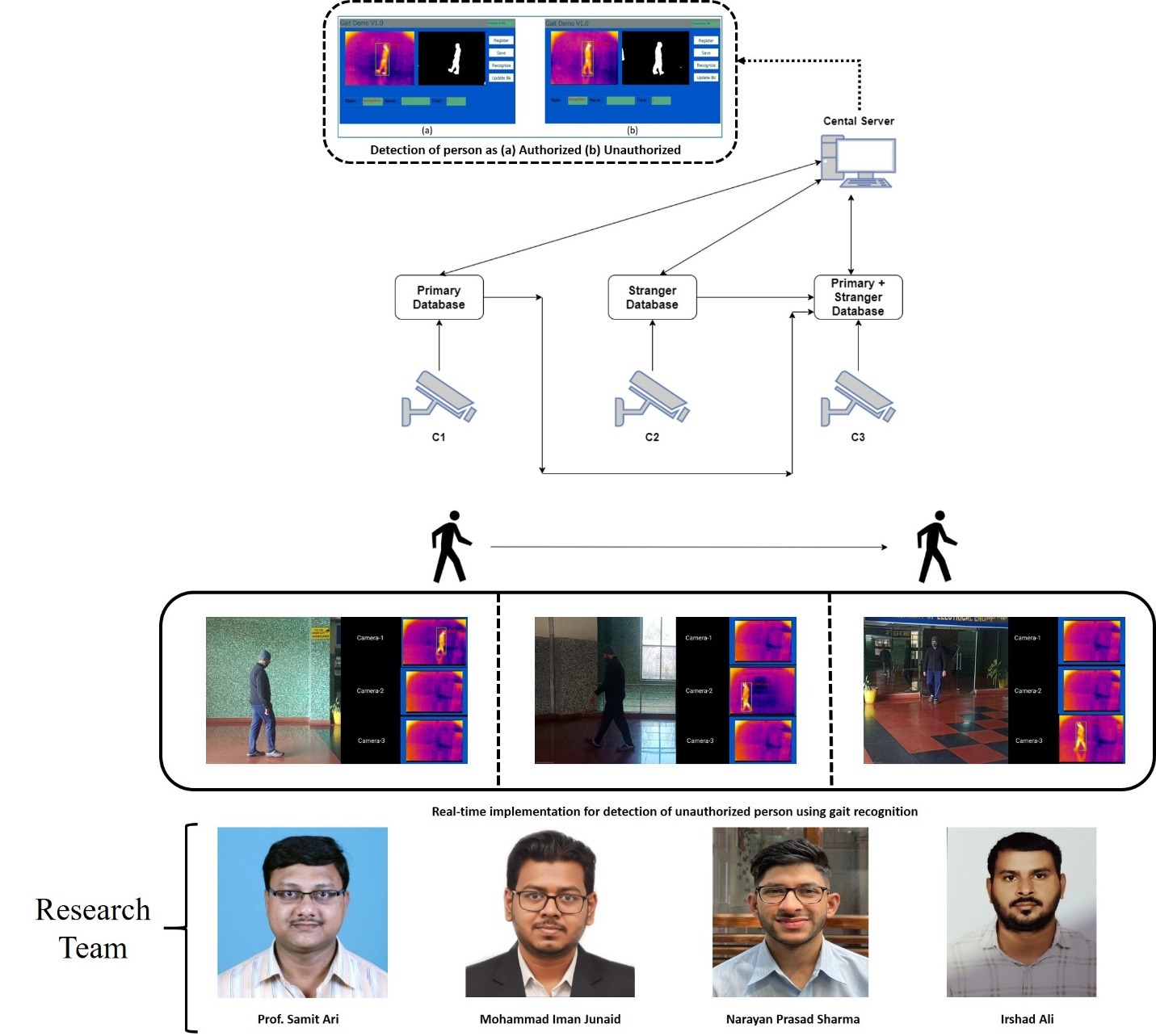 इस उद्देश्य को प्राप्त करने के लिए, शोध टीम ने मानव चाल (गेट) को एक बायोमेट्रिक पहचान के रूप में उपयोग किया है, जो व्यक्तियों की विशिष्ट चलने की शैली के आधार पर उनकी पहचान करता है, जिससे मैनुअल निगरानी की आवश्यकता कम हो जाती है। जब कोई व्यक्ति प्रतिबंधित क्षेत्र में प्रवेश करता है, तो यह प्रणाली उसकी चाल की तुलना अधिकृत व्यक्तियों के डेटा से करती है। यदि मेल नहीं मिलता है, तो प्रणाली उसे संदिग्ध के रूप में चिह्नित करती है और सुरक्षा को सतर्क करती है। शोध दल ने तीन थर्मल कैमरों से युक्त एक कार्यशील प्रोटोटाइप विकसित किया है, जो यूएसबी इंटरफेस के माध्यम से एक केंद्रीय सर्वर से जुड़े हैं। यह प्रणाली प्रवेशद्वार पर अनधिकृत व्यक्तियों का पता लगाती है, उनके मूवमेंट को कई चेकपॉइंट्स के माध्यम से ट्रैक करती है, अज्ञात व्यक्तियों के लिए एक अस्थायी डेटाबेस बनाए रखती है, और गति की दिशा के आधार पर प्रवेश और निकास पैटर्न निर्धारित करती है। यदि कोई व्यक्ति प्रतिबंधित क्षेत्र से बाहर निकल जाता है, तो उसका अस्थायी रिकॉर्ड हटा दिया जाता है, जबकि ऐतिहासिक डेटा भविष्य के संदर्भ और फोरेंसिक उपयोग के लिए सुरक्षित रखा जाता है।