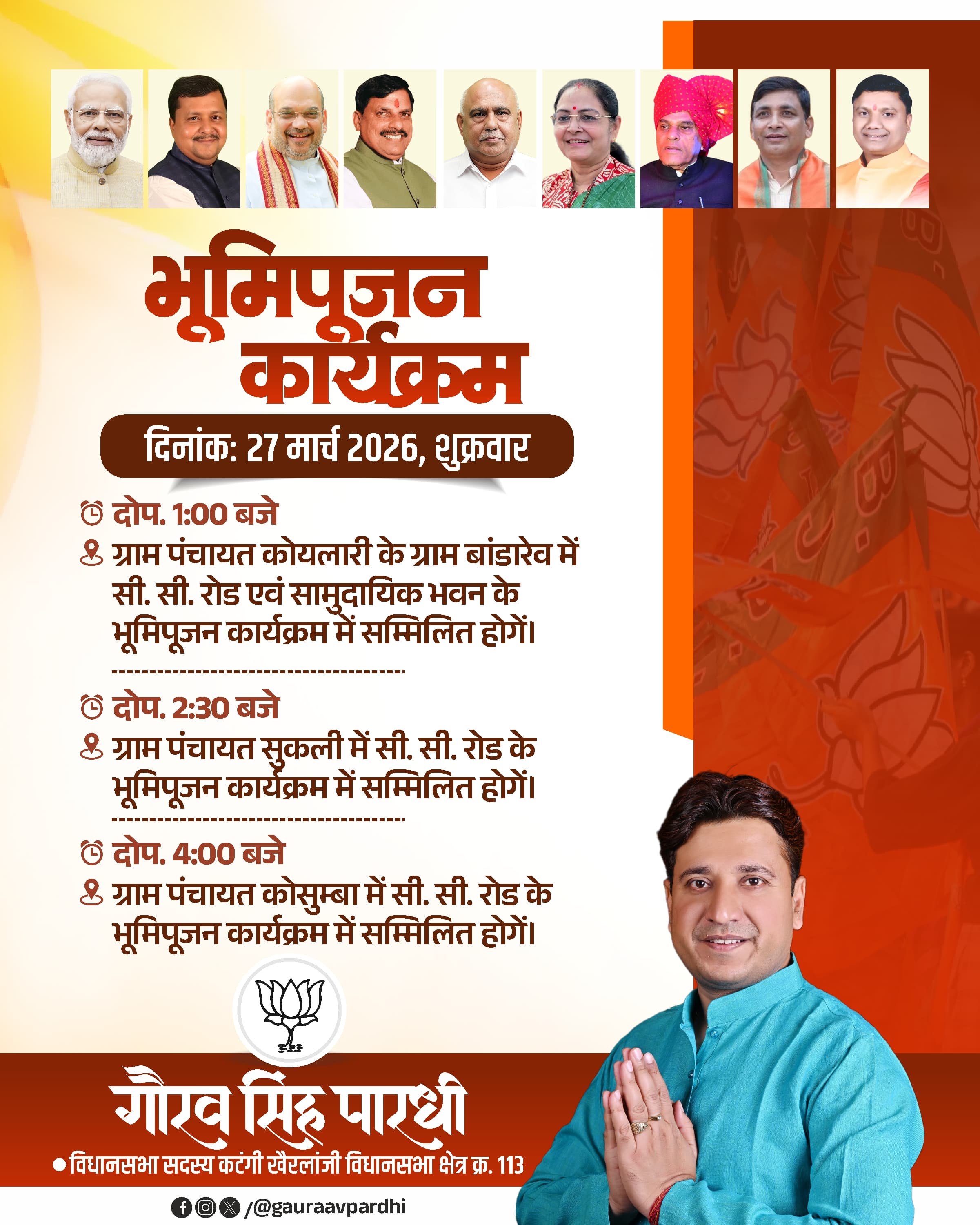कार्यक्रमों में स्थानीय जनप्रतिनिधि, पार्टी कार्यकर्ता एवं बड़ी संख्या में आम नागरिक उपस्थित रहेंगे। इस अवसर पर विधायक श्री पारधी जी जनता को संबोधित करते हुए सरकार की योजनाओं और विकास कार्यों की जानकारी भी देंगे। साथ ही, वे क्षेत्रवासियों की समस्याएं सुनकर उनके निराकरण का आश्वासन देंगे।