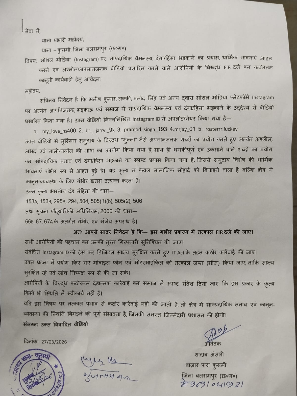 मामले की गंभीरता को देखते हुए मुस्लिम समाज के प्रतिनिधियों एवं स्थानीय नागरिकों ने थाना कुसमी पहुंचकर ज्ञापन सौंपा। ज्ञापन में संबंधित इंस्टाग्राम आईडी को तत्काल ट्रेस करने, आरोपियों की पहचान कर शीघ्र गिरफ्तारी करने तथा उनके विरुद्ध आईटी एक्ट एवं अन्य प्रासंगिक धाराओं के तहत कठोर कानूनी कार्रवाई करने की मांग की गई है। साथ ही स्पष्ट रूप से उल्लेख किया गया है कि आरोपियों के खिलाफ तत्काल FIR दर्ज की जाए।