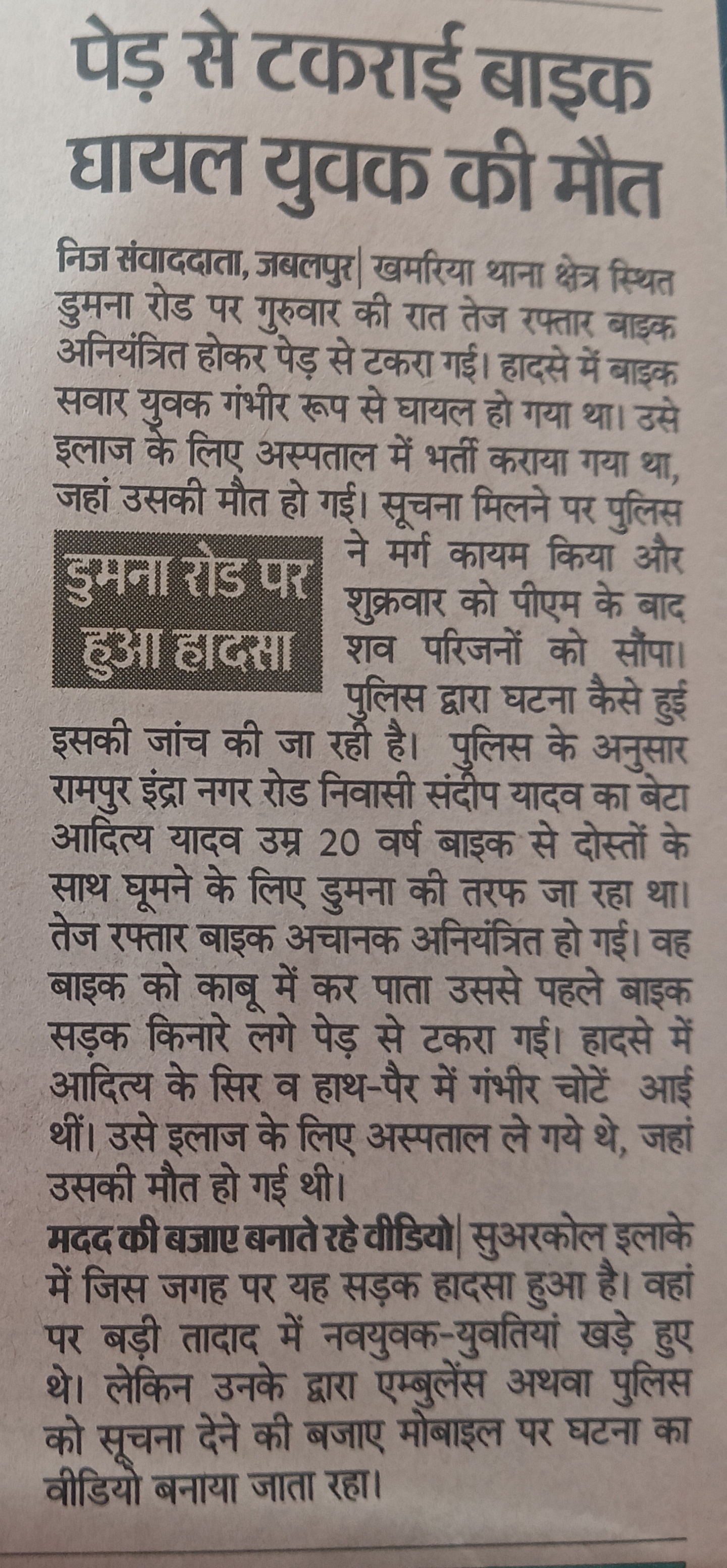 पेड़ से टकराई बाइक घायल युवक की मौत