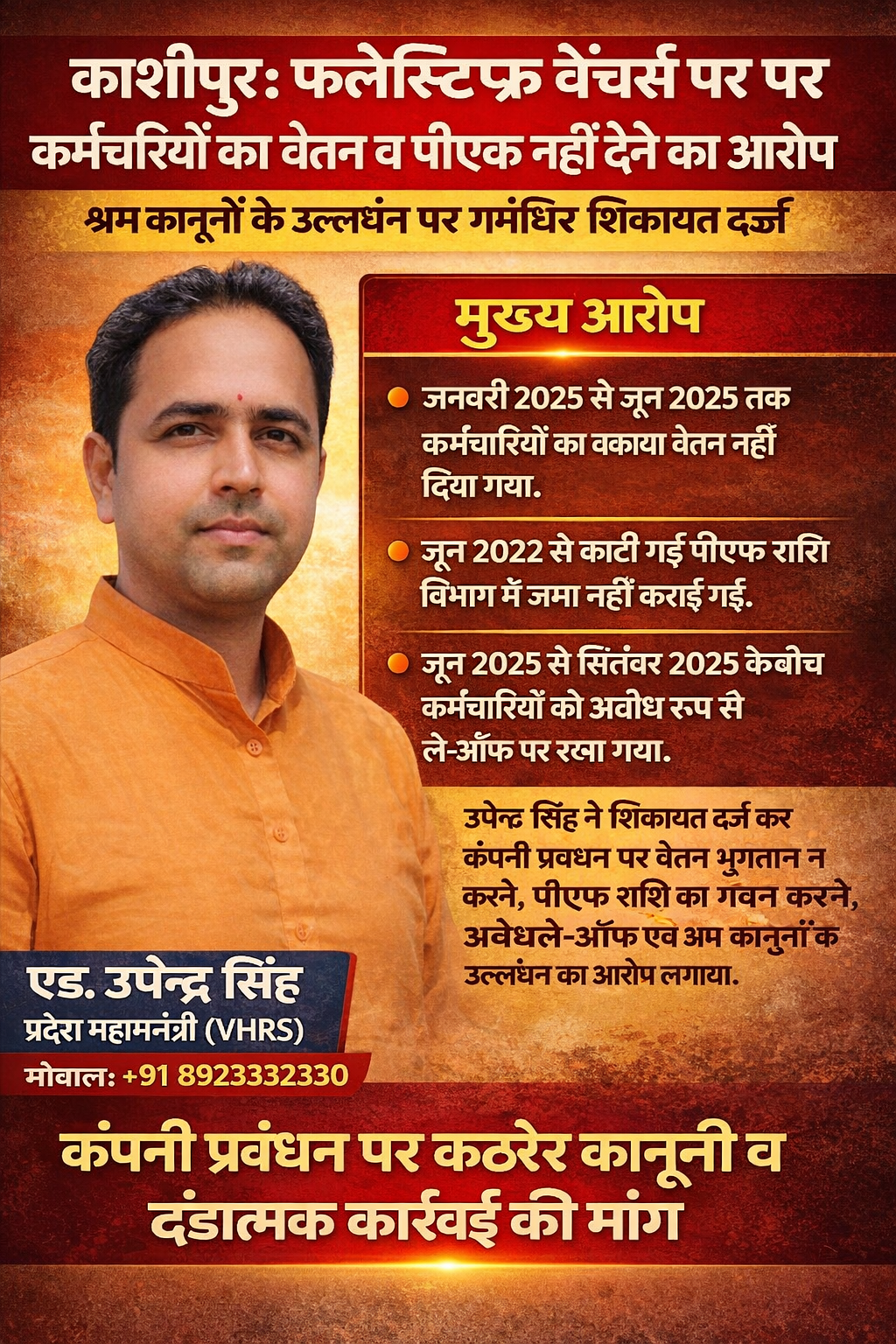 काशीपुर में बड़ा श्रम घोटाला! फ्लेक्सिटफ वेंचर्स पर वेतन व पीएफ हड़पने का आरोप #upendrasingh