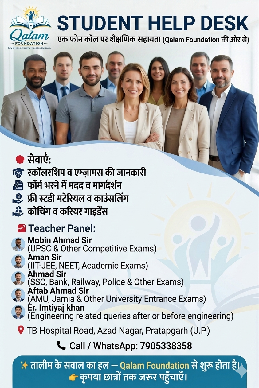 тАЛрдХреНрдпрд╛ рдЖрдк рдЕрдкрдиреА рдкреЭрд╛рдИ, рд╕реНрдХреЙрд▓рд░рд╢рд┐рдк рдпрд╛ рдХрд░рд┐рдпрд░ рдХреЛ рд▓реЗрдХрд░ рдЙрд▓рдЭрди рдореЗрдВ рд╣реИрдВ? Qalam Foundation рдЕрдм рдЖрдкрдХреЗ рд╕рд╛рде рд╣реИ! рд╣рдордиреЗ рдЦрд╛рд╕ рддреМрд░ рдкрд░ рдЫрд╛рддреНрд░реЛрдВ рдХреА рдорджрдж рдХреЗ рд▓рд┐рдП рдПрдХ 'Student Help Desk' рдХреА рд╢реБрд░реБрдЖрдд рдХреА рд╣реИ, рдЬрд╣рд╛рдБ рдЖрдкрдХреЛ рд╕рд┐рд░реНрдл рдПрдХ рдлреЛрди рдХреЙрд▓ рдкрд░ рд╢реИрдХреНрд╖рдгрд┐рдХ рд╕рд╣рд╛рдпрддрд╛ рдорд┐рд▓реЗрдЧреАред