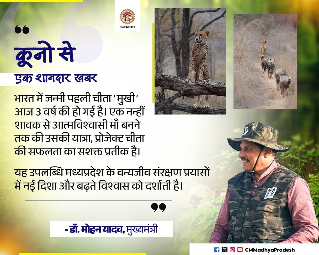 मुख्यमंत्री डॉ मोहन यादव ने भारत में जन्मी पहली चीता "मुखी" के जन्म के 3 वर्ष पूर्ण होने पर प्रसन्नता व्यक्त की।