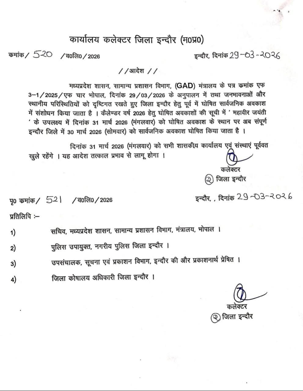 इंदौर जिले में 30 मार्च को महाबीर जयंती पर अवकाश रहेगा