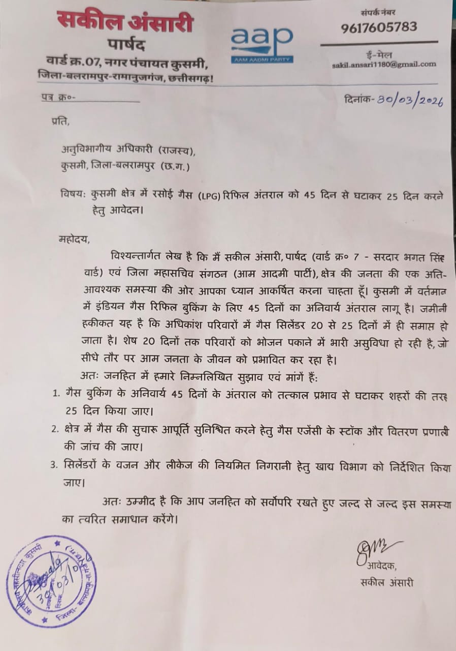 कुसमी क्षेत्र में रसोई गैस (LPG) रिफिल अंतराल घटाने की मांग, आप पार्टी ने तहसीलदार को सौंपा गया ज्ञापन.!