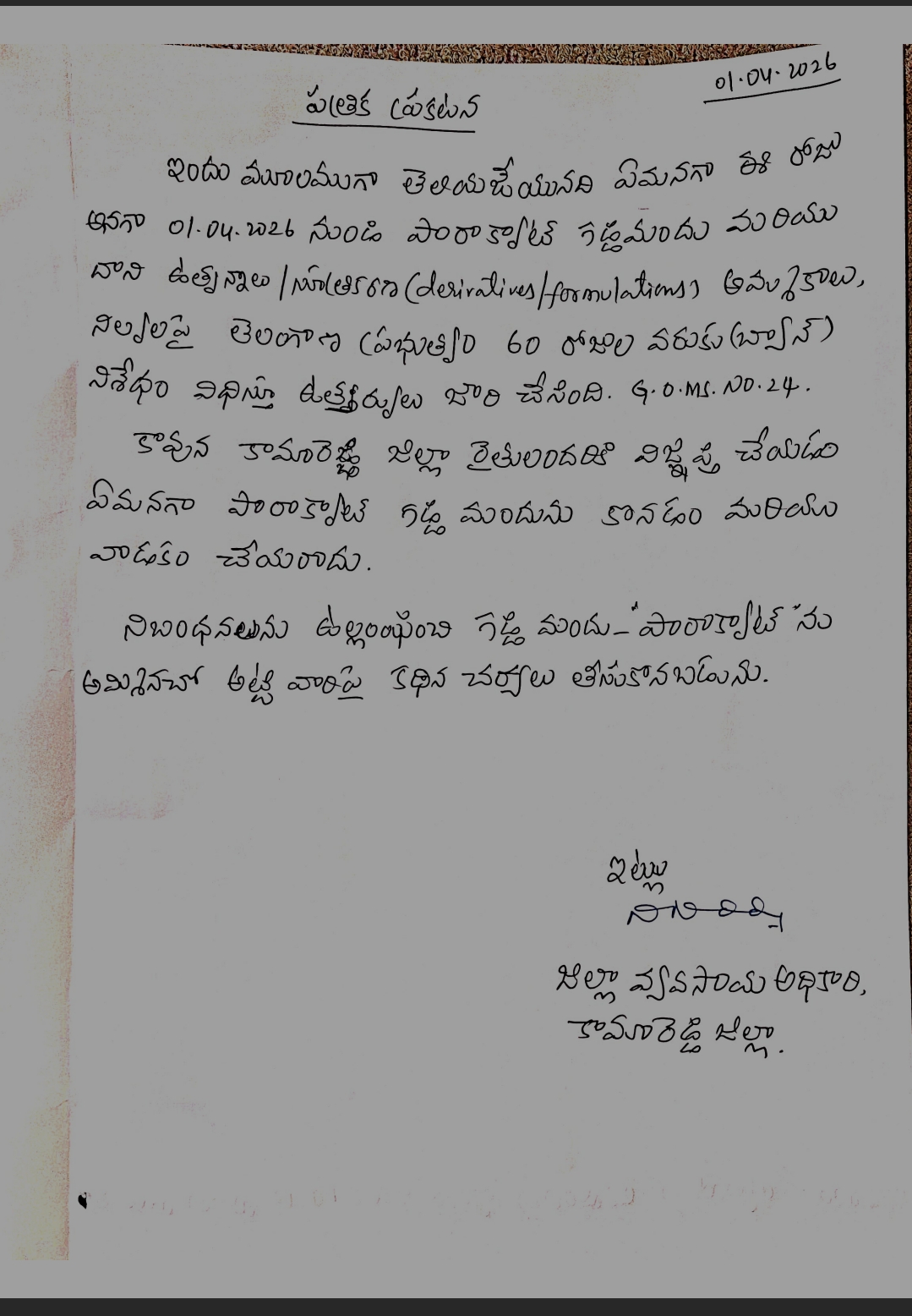 తెలంగాణ ప్రభుత్వం రాష్ట్రవ్యాప్తంగా పారాక్వాట్ (Paraquat) గడ్డిమందు పై నిషేధం విధించిన విషయం తెలియ జేయబడుచున్నది.