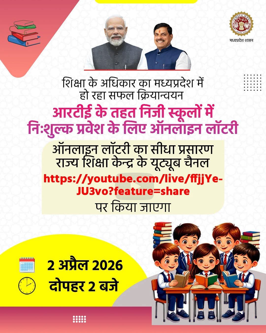 भोपाल। राज्‍य शिक्षा केन्‍द्र द्वारा गुरुवार 2 अप्रेल 2026 को दोपहर 2 बजे निःशुल्क एवं अनिवार्य बाल शिक्षा का अधिकार अधिनियम के तहत अशासकीय स्कूलों में निःशुल्क प्रवेश के लिये ऑनलाइन लॉटरी संचालित की जायेगी। जिसका सीधा प्रसारण राज्‍य शिक्षा केन्‍द्र के यूट्यूब चैनल https://youtube.com/live/ffjjYeJU3vo?feature=share पर किया जायेगा।