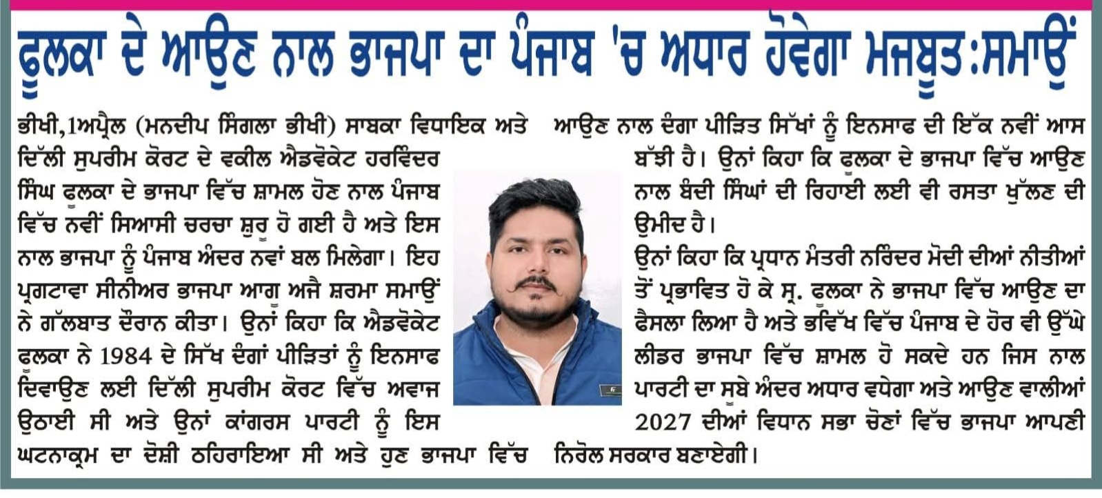 ਫੂਲਕਾਂ ਦੀ ਆਉਣ ਨਾਲ ਭਾਜਪਾ ਦਾ ਪੰਜਾਬ ਚ ਅਧਾਰ ਹੋਵੇਗਾ ਮਜ਼ਬੂਤ: ਅਜੇ ਸਮਾਉਂ