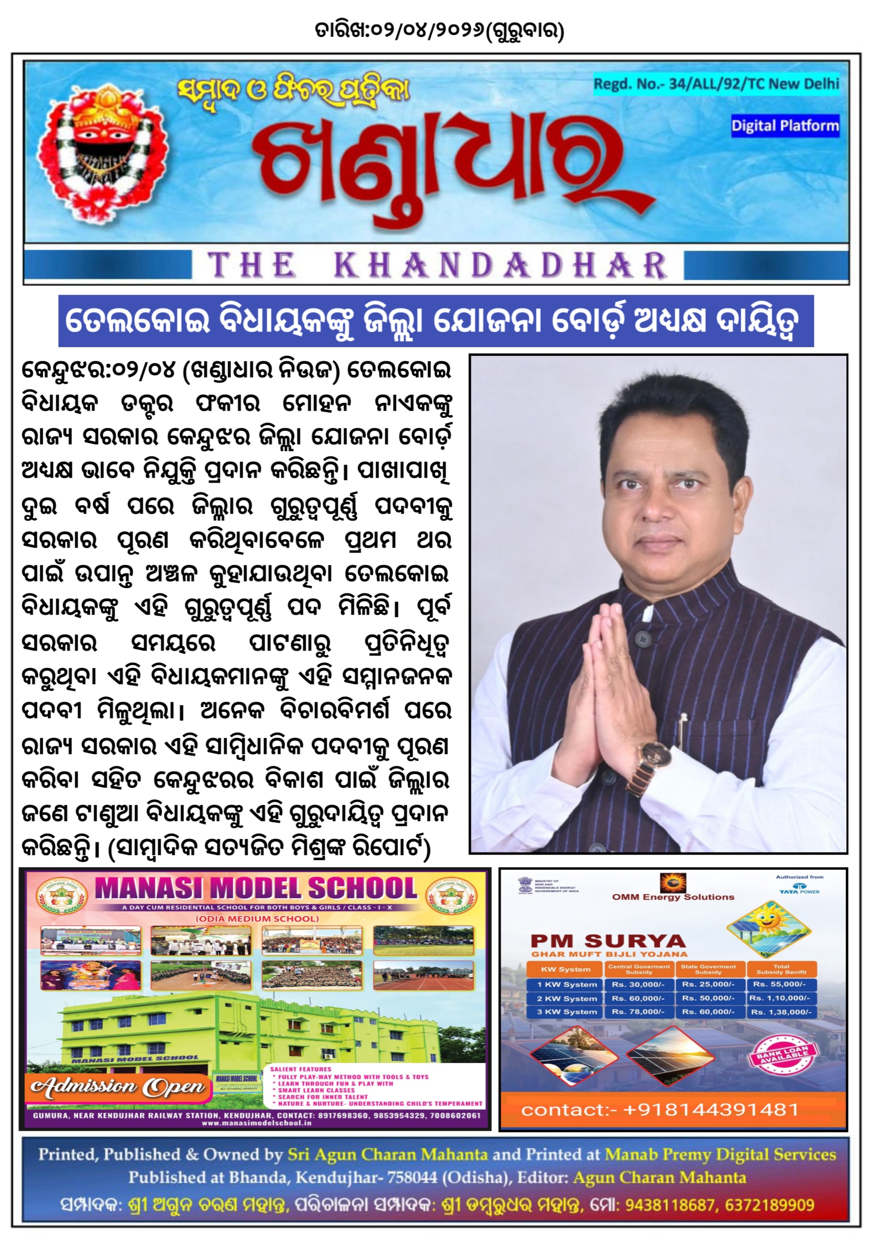କେନ୍ଦୁଝର:୦୨/୦୪ (ଖଣ୍ଡାଧାର ନିଉଜ) ତେଲକୋଇ ବିଧାୟକ ଡକ୍ଟର ଫକୀର ମୋହନ ନାଏକଙ୍କୁ ରାଜ୍ୟ ସରକାର କେନ୍ଦୁଝର ଜିଲ୍ଲା ଯୋଜନା ବୋର୍ଡ଼ ଅଧ୍ୟକ୍ଷ ଭାବେ ନିଯୁକ୍ତି ପ୍ରଦାନ କରିଛନ୍ତି। ପାଖାପାଖି ଦୁଇ ବର୍ଷ ପରେ ଜିଲ୍ଳାର ଗୁରୁତ୍ୱପୂର୍ଣ୍ଣ ପଦବୀକୁ ସରକାର ପୂରଣ କରିଥିବାବେଳେ ପ୍ରଥମ ଥର ପାଇଁ ଉପାନ୍ତ ଅଞ୍ଚଳ କୁହାଯାଉଥିବା ତେଲକୋଇ ବିଧାୟକଙ୍କୁ ଏହି ଗୁରୁତ୍ୱପୂର୍ଣ୍ଣ ପଦ ମିଳିଛି। ପୂର୍ବ ସରକାର ସମୟରେ ପାଟଣାରୁ ପ୍ରତିନିଧିତ୍ବ କରୁଥିବା ଏହି ବିଧାୟକମାନଙ୍କୁ ଏହି ସମ୍ମାନଜନକ ପଦବୀ ମିଳୁଥିଲା। ଅନେକ ବିଚାରବିମର୍ଶ ପରେ ରାଜ୍ୟ ସରକାର ଏହି ସାମ୍ବିଧାନିକ ପଦବୀକୁ ପୂରଣ କରିବା ସହିତ କେନ୍ଦୁଝରର ବିକାଶ ପାଇଁ ଜିଲ୍ଲାର ଜଣେ ଟାଣୁଆ ବିଧାୟକଙ୍କୁ ଏହି ଗୁରୁଦାୟିତ୍ୱ ପ୍ରଦାନ କରିଛନ୍ତି।