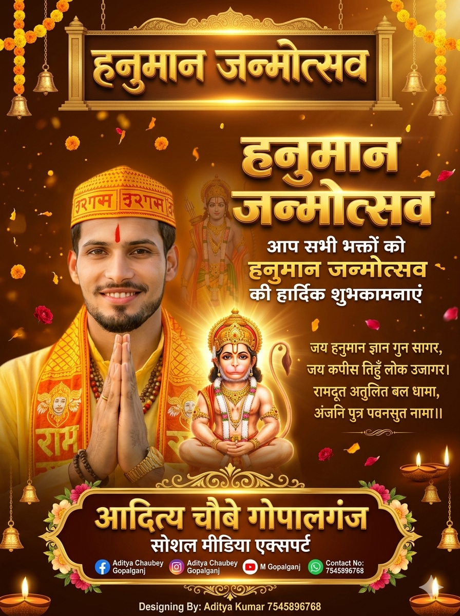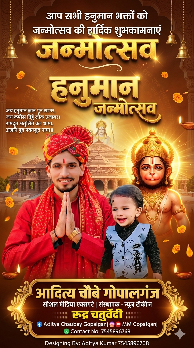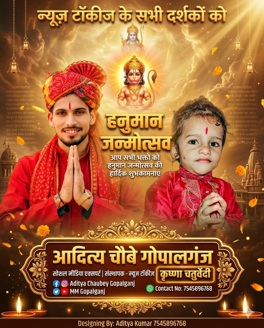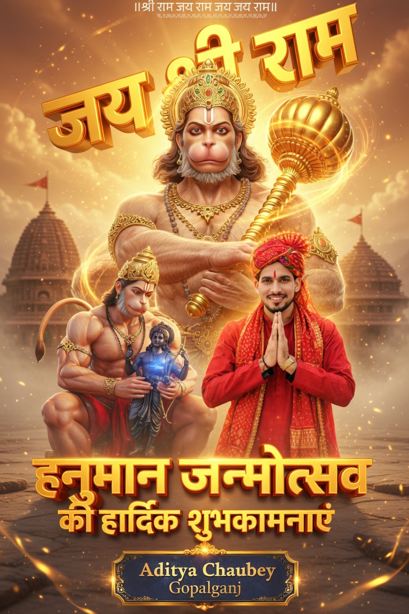 рд╣рдиреБрдорд╛рди рдЬрдиреНрдореЛрддреНрд╕рд╡ рдХреЗ рдкрд╛рд╡рди рдЕрд╡рд╕рд░ рдкрд░ рдЧреЛрдкрд╛рд▓рдЧрдВрдЬ рдХреЗ рдЧреНрд░рд╛рдо рднреВрдкрддрд┐рдкреБрд░ рдирд┐рд╡рд╛рд╕реА рдЖрджрд┐рддреНрдп рдЪреМрдмреЗ (рд╕реЛрд╢рд▓ рдореАрдбрд┐рдпрд╛ рдПрдХреНрд╕рдкрд░реНрдЯ, рдЧреНрд░рд╛рдлрд┐рдХ рдбрд┐рдЬрд╝рд╛рдЗрдирд░ рдПрд╡рдВ рдиреНрдпреВрдЬрд╝ рд░рд┐рдкреЛрд░реНрдЯрд░) рдиреЗ рдЕрдкрдиреЗ рджреЛ рдкреБрддреНрд░реЛрдВ рдХреГрд╖реНрдг рдЪрддреБрд░реНрд╡реЗрджреА рдПрд╡рдВ рд░реБрджреНрд░ рдЪрддреБрд░реНрд╡реЗрджреА рдХреЗ рд╕рд╛рде рд╕рднреА рджреЗрд╢рд╡рд╛рд╕рд┐рдпреЛрдВ рдХреЛ рд╣рд╛рд░реНрджрд┐рдХ рд╢реБрднрдХрд╛рдордирд╛рдПрдВ рджреА рд╣реИрдВред
