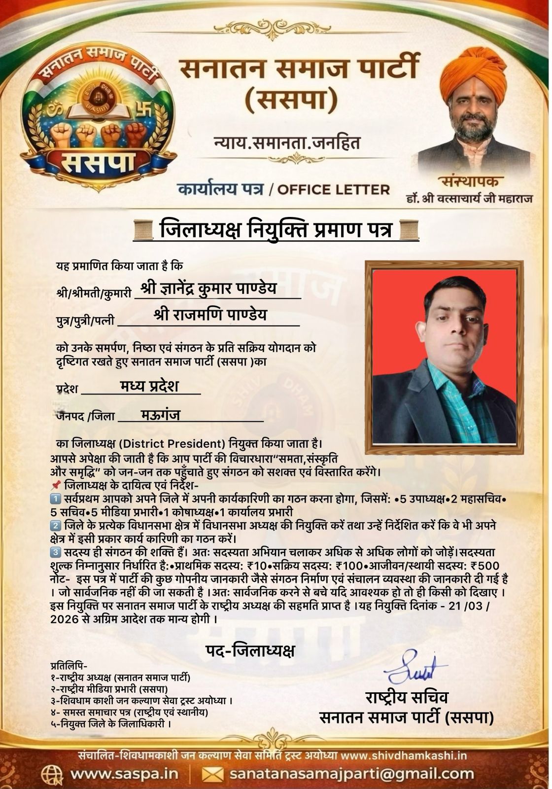 सनातन समाज पार्टी ने ज्ञानेन्द्र कुमार पाण्डेय को मऊगंज जिला अध्यक्ष किया नियुक्त