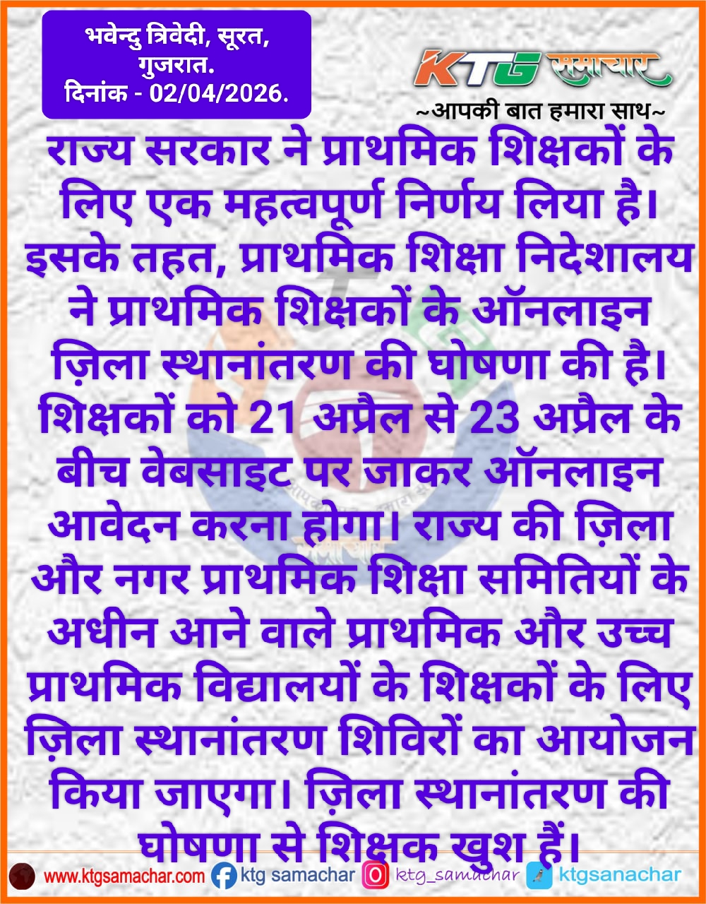 प्राथमिक शिक्षा निदेशालय ने प्राथमिक शिक्षकों के ऑनलाइन ज़िला स्थानांतरण की घोषणा की है।