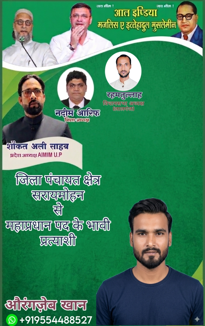 जिला पंचायत क्षेत्र सारायमोहन में आगामी चुनाव को लेकर राजनीतिक माहौल गर्म होता जा रहा है। All India Majlis-e-Ittehadul Muslimeen (AIMIM) से जुड़े कार्यकर्ता और समर्थक सक्रिय हो गए हैं। इसी कड़ी में औरंगज़ेब खान ने महाप्रधान पद के भावी प्रत्याशी के रूप में अपनी दावेदारी पेश की है।