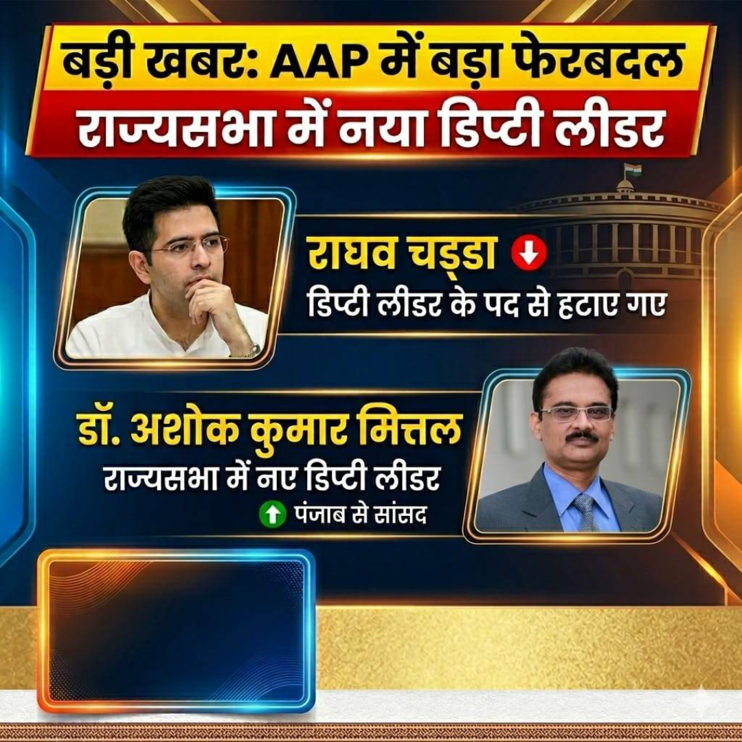 *हेडलाइन*: आम आदमी पार्टी (AAP) में बड़ा फेरबदल – राज्यसभा में नया डिप्टी लीडर नियुक्त, राघव चड्ढा को पद से हटाकर डॉ. अशोक कुमार मित्तल को बनाया गया