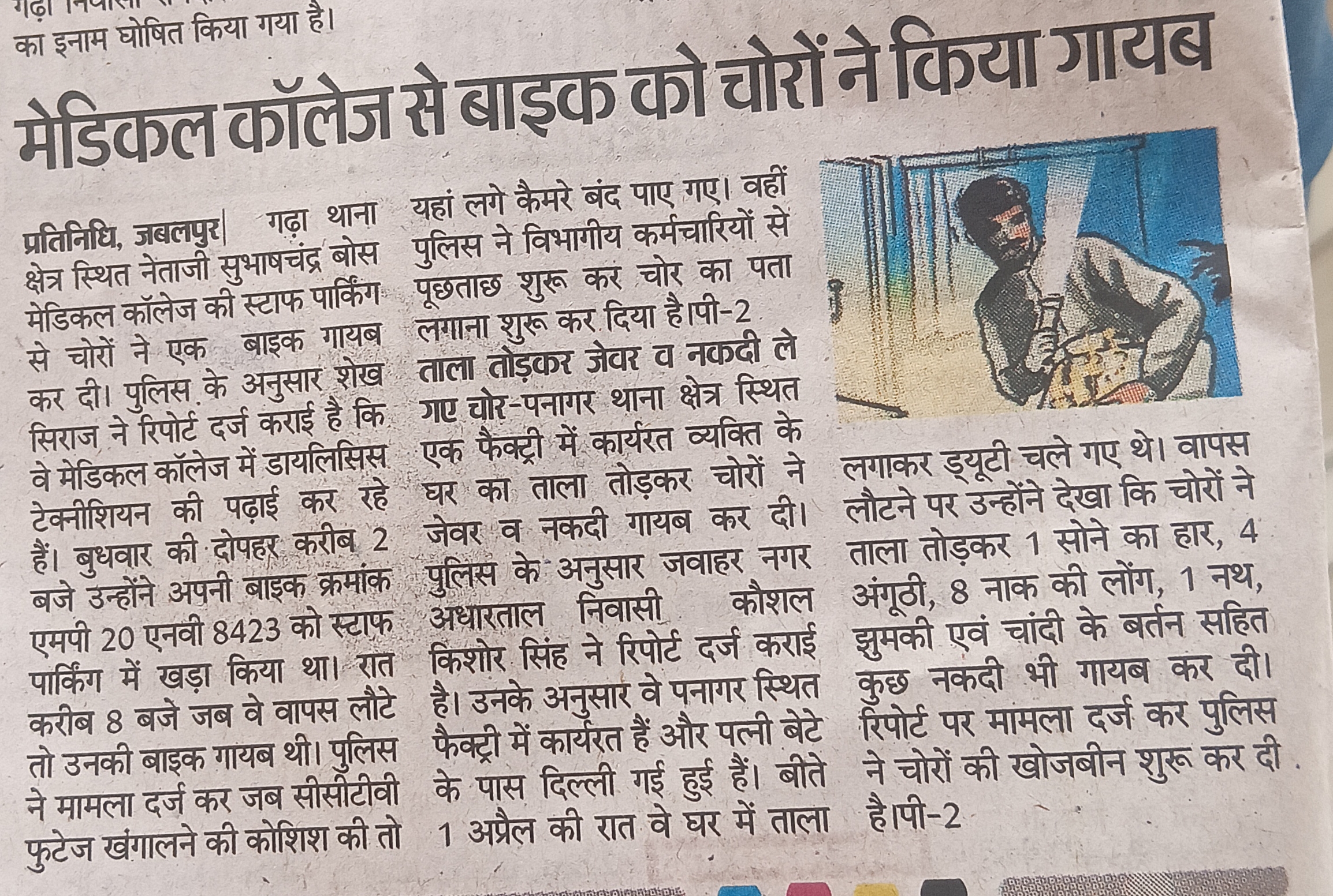 गढ़ा थाना क्षेत्र में नेताजी सुभाष चंद्र बोस मेडिकल कॉलेज की स्टाफ पार्किंग से चोरों नें एक बाइक गायब कर दी