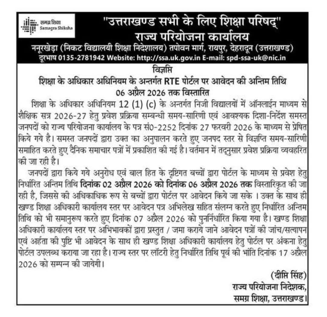 उत्तराखंड में RTE के तहत आवेदन करने की अंतिम तिथि आगे बढ़ाई गई है। पहले अंतिम तिथि ०२ अप्रैल २०२६ थी, जो अब ०६ अप्रैल २०२६ हो चुकी है। RTE के तहत जो अभिभावक आवेदन करने से चूक गए थे उनके लिए और उनके पालियों के लिए यह एक सुनहरा अवसर है।
