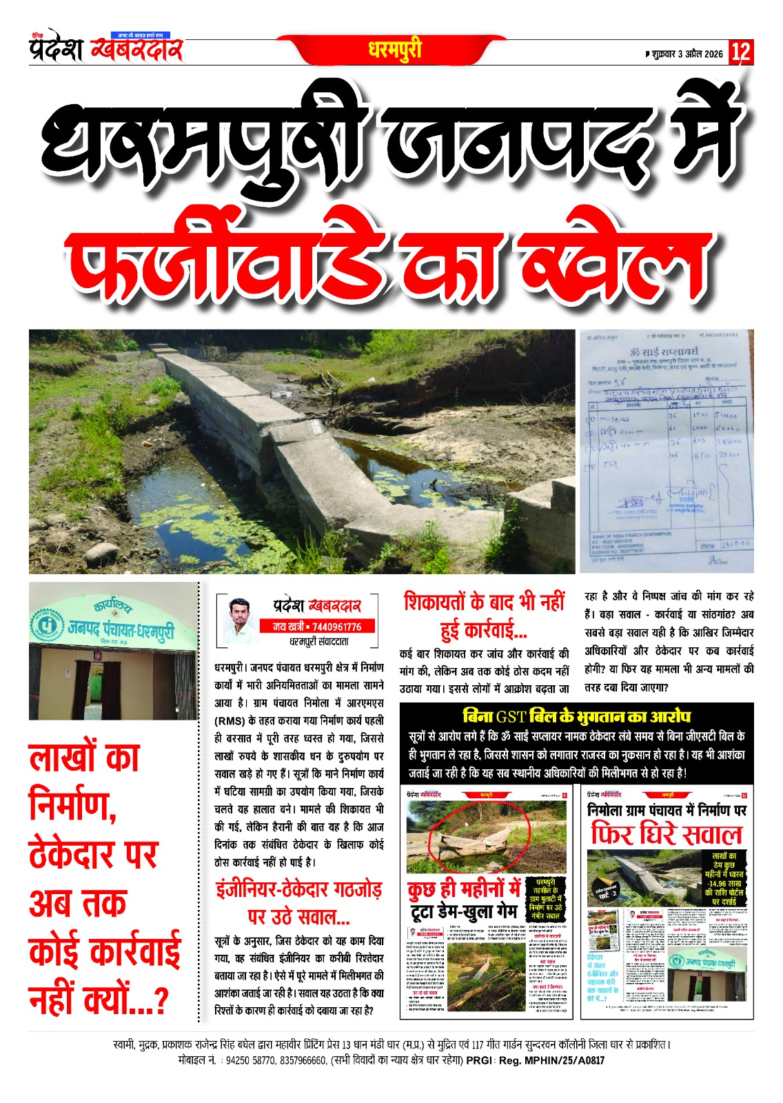 धार जिले के धरमपुरी जनपद पंचायत क्षेत्र में सामने आए निर्माण घोटाले ने अब और गंभीर रूप ले लिया है। ग्राम पंचायत निमोला में आरएमएस योजना के तहत कराया गया निर्माण पहली ही बरसात में जमींदोज होने के बाद भी जिम्मेदारों की चुप्पी कई सवाल खड़े कर रही है।