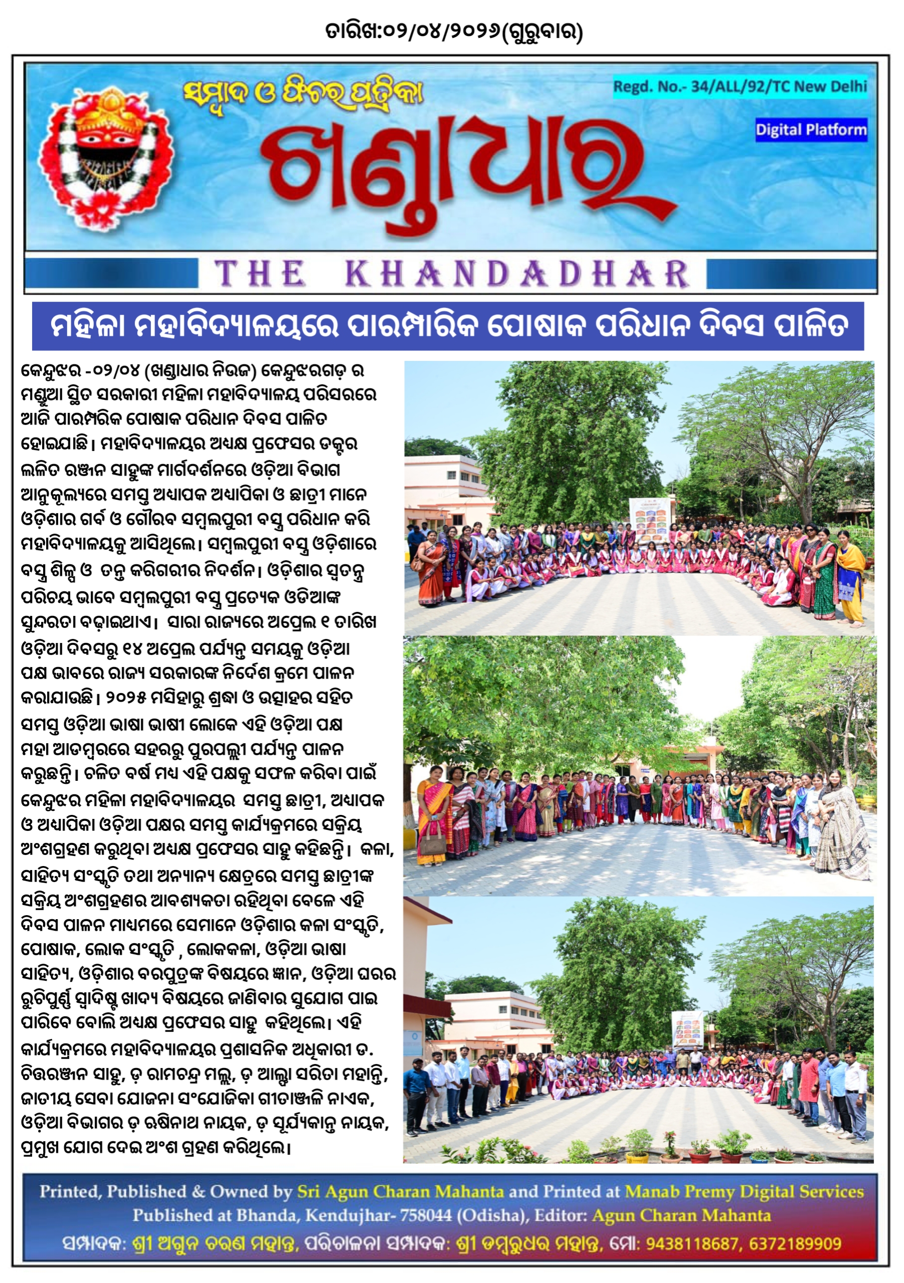 କେନ୍ଦୁଝର -୨/୪ (ଖଣ୍ଡାଧାର ନିଉଜ) କେନ୍ଦୁଝରଗଡ଼ ର ମଣ୍ଡୁଆ ସ୍ଥିତ ସରକାରୀ ମହିଳା ମହାବିଦ୍ୟାଳୟ ପରିସରରେ ଆଜି ପାରମ୍ପରିକ ପୋଷାକ ପରିଧାନ ଦିବସ ପାଳିତ ହୋଇଯାଛି। ମହାବିଦ୍ୟାଳୟର ଅଧ୍ୟକ୍ଷ ପ୍ରଫେସର ଡକ୍ଟର ଲଳିତ ରଞ୍ଜନ ସାହୁଙ୍କ ମାର୍ଗଦର୍ଶନରେ ଓଡ଼ିଆ ବିଭାଗ ଆନୁକୂଲ୍ୟରେ ସମସ୍ତ ଅଧ୍ୟାପକ ଅଧ୍ୟାପିକା ଓ ଛାତ୍ରୀ ମାନେ ଓଡ଼ିଶାର ଗର୍ବ ଓ ଗୌରବ ସମ୍ବଲପୁରୀ ବସ୍ତ୍ର ପରିଧାନ କରି ମହାବିଦ୍ୟାଳୟକୁ ଆସିଥିଲେ। ସମ୍ବଲପୁରୀ ବସ୍ତ୍ର ଓଡ଼ିଶାରେ ବସ୍ତ୍ର ଶିଳ୍ପ ଓ ତନ୍ତ କରିଗରୀର ନିଦର୍ଶନ। ଓଡ଼ିଶାର ସ୍ୱତନ୍ତ୍ର ପରିଚୟ ଭାବେ ସମ୍ବଲପୁରୀ ବସ୍ତ୍ର ପ୍ରତ୍ୟେକ ଓଡିଆଙ୍କ ସୁନ୍ଦରତା ବଢ଼ାଇଥାଏ। ସାରା ରାଜ୍ୟରେ ଅପ୍ରେଲ ୧ ତାରିଖ ଓଡ଼ିଆ ଦିବସରୁ ୧୪ ଅପ୍ରେଲ ପର୍ଯ୍ୟନ୍ତ ସମୟକୁ ଓଡ଼ିଆ ପକ୍ଷ ଭାବରେ ରାଜ୍ୟ ସରକାରଙ୍କ ନିର୍ଦେଶ କ୍ରମେ ପାଳନ କରାଯାଉଛି। ୨୦୨୫ ମସିହାରୁ ଶ୍ରଦ୍ଧା ଓ ଉତ୍ସାହର ସହିତ ସମସ୍ତ ଓଡ଼ିଆ ଭାଷା ଭାଷୀ ଲୋକେ ଏହି ଓଡ଼ିଆ ପକ୍ଷ ମହା ଆଡମ୍ବରରେ ସହରରୁ ପୁରପଲ୍ଲୀ ପର୍ଯ୍ୟନ୍ତ ପାଳନ କରୁଛନ୍ତି। ଚଳିତ ବର୍ଷ ମଧ୍ୟ ଏହି ପକ୍ଷକୁ ସଫଳ କରିବା ପାଇଁ କେନ୍ଦୁଝର ମହିଳା ମହାବିଦ୍ୟାଳୟର ସମସ୍ତ ଛାତ୍ରୀ, ଅଧ୍ୟାପକ ଓ ଅଧ୍ୟାପିକା ଓଡ଼ିଆ ପକ୍ଷର ସମସ୍ତ କାର୍ଯ୍ୟକ୍ରମରେ ସକ୍ରିୟ ଅଂଶଗ୍ରହଣ କରୁଥିବା ଅଧ୍ୟକ୍ଷ ପ୍ରଫେସର ସାହୁ କହିଛନ୍ତି। କଳା, ସାହିତ୍ୟ ସଂସ୍କୃତି ତଥା ଅନ୍ୟାନ୍ୟ କ୍ଷେତ୍ରରେ ସମସ୍ତ ଛାତ୍ରୀଙ୍କ ସକ୍ରିୟ ଅଂଶଗ୍ରହଣର ଆବଶ୍ୟକ‌ତା ରହିଥିବା ବେଳେ ଏହି ଦିବସ ପାଳନ ମାଧ୍ୟମରେ ସେମାନେ ଓଡ଼ିଶାର କଳା ସଂସ୍କୃତି, ପୋଷାକ, ଲୋକ ସଂସ୍କୃତି , ଲୋକକଳା, ଓଡ଼ିଆ ଭାଷା ସାହିତ୍ୟ, ଓଡ଼ିଶାର ବରପୁତ୍ରଙ୍କ ବିଷୟରେ ଜ୍ଞାନ, ଓଡ଼ିଆ ଘରର ରୁଚିପୁର୍ଣ୍ଣ ସ୍ୱାଦିଷ୍ଟ ଖାଦ୍ୟ ବିଷୟରେ ଜାଣିବାର ସୁଯୋଗ ପାଇ ପାରିବେ ବୋଲି ଅଧ୍ୟକ୍ଷ ପ୍ରଫେସର ସାହୁ କହିଥିଲେ। ଏହି କାର୍ଯ୍ୟକ୍ରମରେ ମହାବିଦ୍ୟାଳୟର ପ୍ରଶାସନିକ ଅଧିକାରୀ ଡ. ଚିତ୍ତରଞ୍ଜନ ସାହୁ, ଡ଼ ରାମଚନ୍ଦ୍ର ମଲ୍ଲ, ଡ଼ ଆଲ୍ଫା ସରିତା ମହାନ୍ତି, ଜାତୀୟ ସେବା ଯୋଜନା ସଂଯୋଜିକା ଗୀତାଞ୍ଜଳି ନାଏକ, ଓଡ଼ିଆ ବିଭାଗର ଡ଼ ଋଷିନାଥ ନାୟକ, ଡ଼ ସୂର୍ଯ୍ୟକାନ୍ତ ନାୟକ, ପ୍ରମୁଖ ଯୋଗ ଦେଇ ଅଂଶ ଗ୍ରହଣ କରିଥିଲେ।