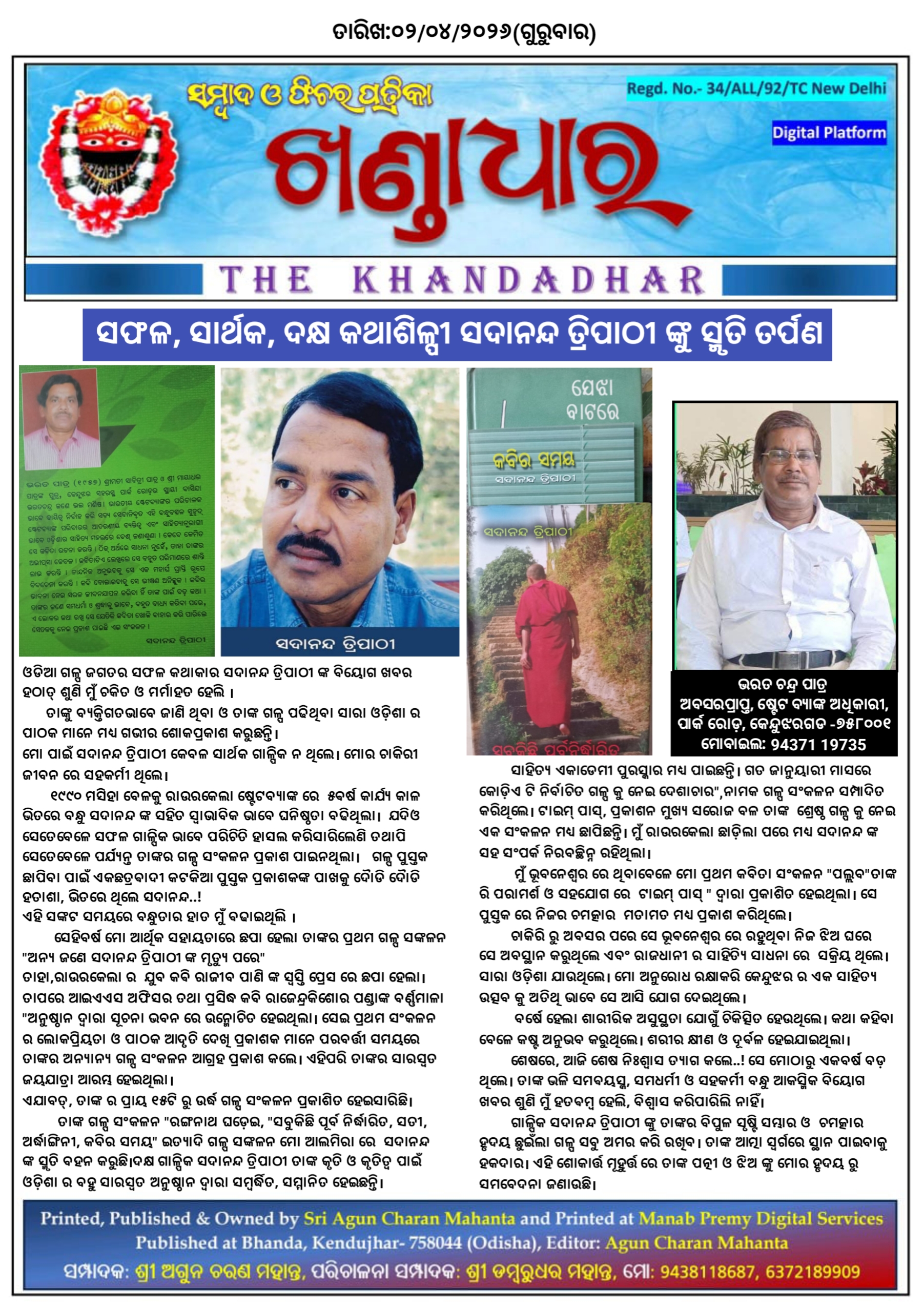 ଓଡିଆ ଗଳ୍ପ ଜଗତର ସଫଳ କଥାକାର ସଦାନନ୍ଦ ତ୍ରିପାଠୀ ଙ୍କ ବିୟୋଗ ଖବର ହଠାତ୍ ଶୁଣି ମୁଁ ଚକିତ ଓ ମର୍ମାହତ ହେଲି ।