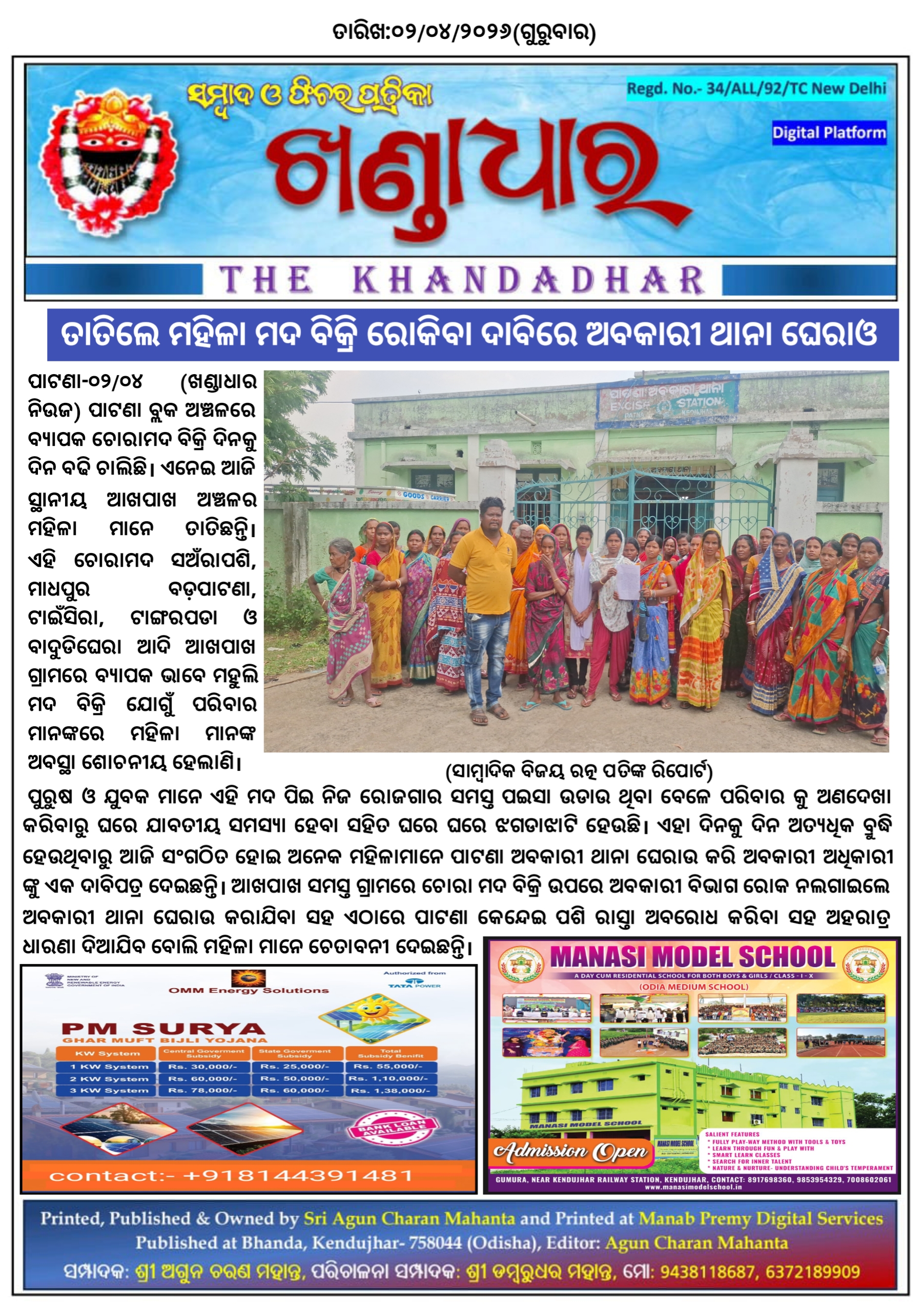 ପାଟଣା-୦୨/୦୪ (ଖଣ୍ଡାଧାର ନିଉଜ) ପାଟଣା ବ୍ଲକ ଅଞ୍ଚଳରେ ବ୍ୟାପକ ଚୋରାମଦ ବିକ୍ରି ଦିନକୁ ଦିନ ବଢି ଚାଲିଛି। ଏନେଇ ଆଜି ସ୍ଥାନୀୟ ଆଖପାଖ ଅଞ୍ଚଳର ମହିଳା ମାନେ ତାତିଛନ୍ତି। ଏହି ଚୋରାମଦ ସଅଁରାପଶି, ମାଧପୁର ବଡ଼ପାଟଣା, ଟାଇଁସିରା, ଟାଙ୍ଗରପଡା ଓ ବାଦୁଡିଘେରା ଆଦି ଆଖପାଖ ଗ୍ରାମରେ ବ୍ୟାପକ ଭାବେ ମହୁଲି ମଦ ବିକ୍ରି ଯୋଗୁଁ ପରିବାର ମାନଙ୍କରେ ମହିଳା ମାନଙ୍କ ଅବସ୍ଥା ଶୋଚନୀୟ ହେଲାଣି। ପୁରୁଷ ଓ ଯୁବକ ମାନେ ଏହି ମଦ ପିଇ ନିଜ ରୋଜଗାର ସମସ୍ତ ପଇସା ଉଡାଉ ଥିବା ବେଳେ ପରିବାର କୁ ଅଣଦେଖା କରିବାରୁ ଘରେ ଯାବତୀୟ ସମସ୍ୟା ହେବା ସହିତ ଘରେ ଘରେ ଝଗଡାଝାଟି ହେଉଛି। ଏହା ଦିନକୁ ଦିନ ଅତ୍ଯଧିକ ବ୍ରୁଦ୍ଧି ହେଉଥିବାରୁ ଆଜି ସଂଗଠିତ ହୋଇ ଅନେକ ମହିଳାମାନେ ପାଟଣା ଅବକାରୀ ଥାନା ଘେରାଉ କରି ଅବକାରୀ ଅଧିକାରୀ ଙ୍କୁ ଏକ ଦାବିପତ୍ର ଦେଇଛନ୍ତି। ଆଖପାଖ ସମସ୍ତ ଗ୍ରାମରେ ଚୋରା ମଦ ବିକ୍ରି ଉପରେ ଅବକାରୀ ବିଭାଗ ରୋକ ନଲଗାଇଲେ ଅବକାରୀ ଥାନା ଘେରାଉ କରାଯିବା ସହ ଏଠାରେ ପାଟଣା କେନ୍ଦେଇ ପଶି ରାସ୍ତା ଅବରୋଧ କରିବା ସହ ଅହରାତ୍ର ଧାରଣା ଦିଆଯିବ ବୋଲି ମହିଳା ମାନେ ଚେତାବନୀ ଦେଇଛନ୍ତି।