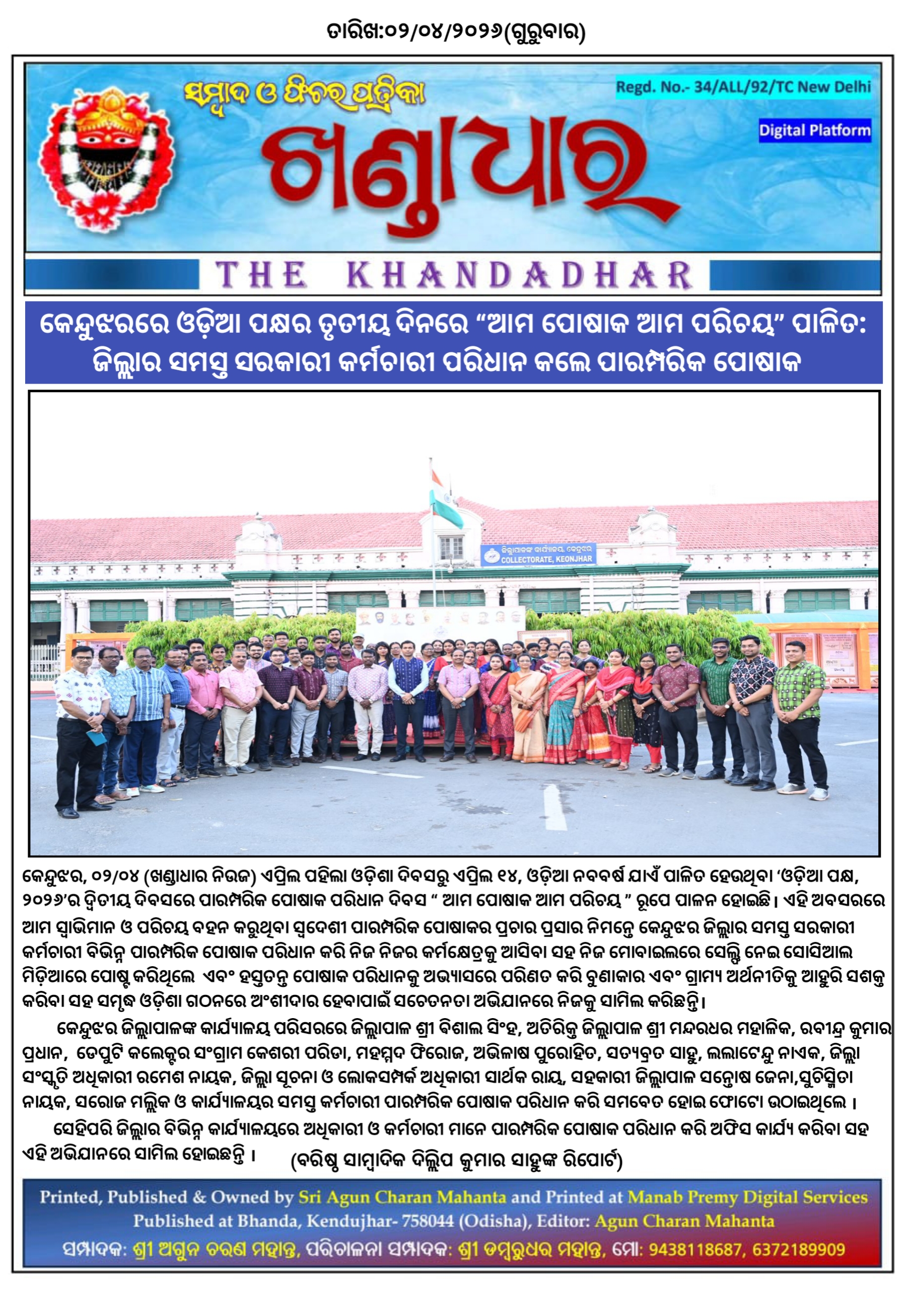 ଏପ୍ରିଲ ପହିଲା ଓଡ଼ିଶା ଦିବସରୁ ଏପ୍ରିଲ ୧୪, ଓଡ଼ିଆ ନବବର୍ଷ ଯାଏଁ ପାଳିତ ହେଉଥିବା ‘ଓଡ଼ିଆ ପକ୍ଷ, ୨୦୨୬’ର ଦ୍ଵିତୀୟ ଦିବସରେ ପାରମ୍ପରିକ ପୋଷାକ ପରିଧାନ ଦିବସ “ ଆମ ପୋଷାକ ଆମ ପରିଚୟ ” ରୂପେ ପାଳନ ହୋଇଛି। ଏହି ଅବସରରେ ଆମ ସ୍ୱାଭିମାନ ଓ ପରିଚୟ ବହନ କରୁଥିବା ସ୍ବଦେଶୀ ପାରମ୍ପରିକ ପୋଷାକର ପ୍ରଚାର ପ୍ରସାର ନିମନ୍ତେ କେନ୍ଦୁଝର ଜିଲ୍ଲାର ସମସ୍ତ ସରକାରୀ କର୍ମଚାରୀ ବିଭିନ୍ନ ପାରମ୍ପରିକ ପୋଷାକ ପରିଧାନ କରି ନିଜ ନିଜର କର୍ମକ୍ଷେତ୍ରକୁ ଆସିବା ସହ ନିଜ ମୋବାଇଲରେ ସେଲ୍ଫି ନେଇ ସୋସିଆଲ ମିଡ଼ିଆରେ ପୋଷ୍ଟ କରିଥିଲେ ଏବଂ ହସ୍ତତନ୍ତ ପୋଷାକ ପରିଧାନକୁ ଅଭ୍ୟାସରେ ପରିଣତ କରି ବୁଣାକାର ଏବଂ ଗ୍ରାମ୍ୟ ଅର୍ଥନୀତିକୁ ଆହୁରି ସଶକ୍ତ କରିବା ସହ ସମୃଦ୍ଧ ଓଡ଼ିଶା ଗଠନରେ ଅଂଶୀଦାର ହେବାପାଇଁ ସଚେତନତା ଅଭିଯାନରେ ନିଜକୁ ସାମିଲ କରିଛନ୍ତି ।