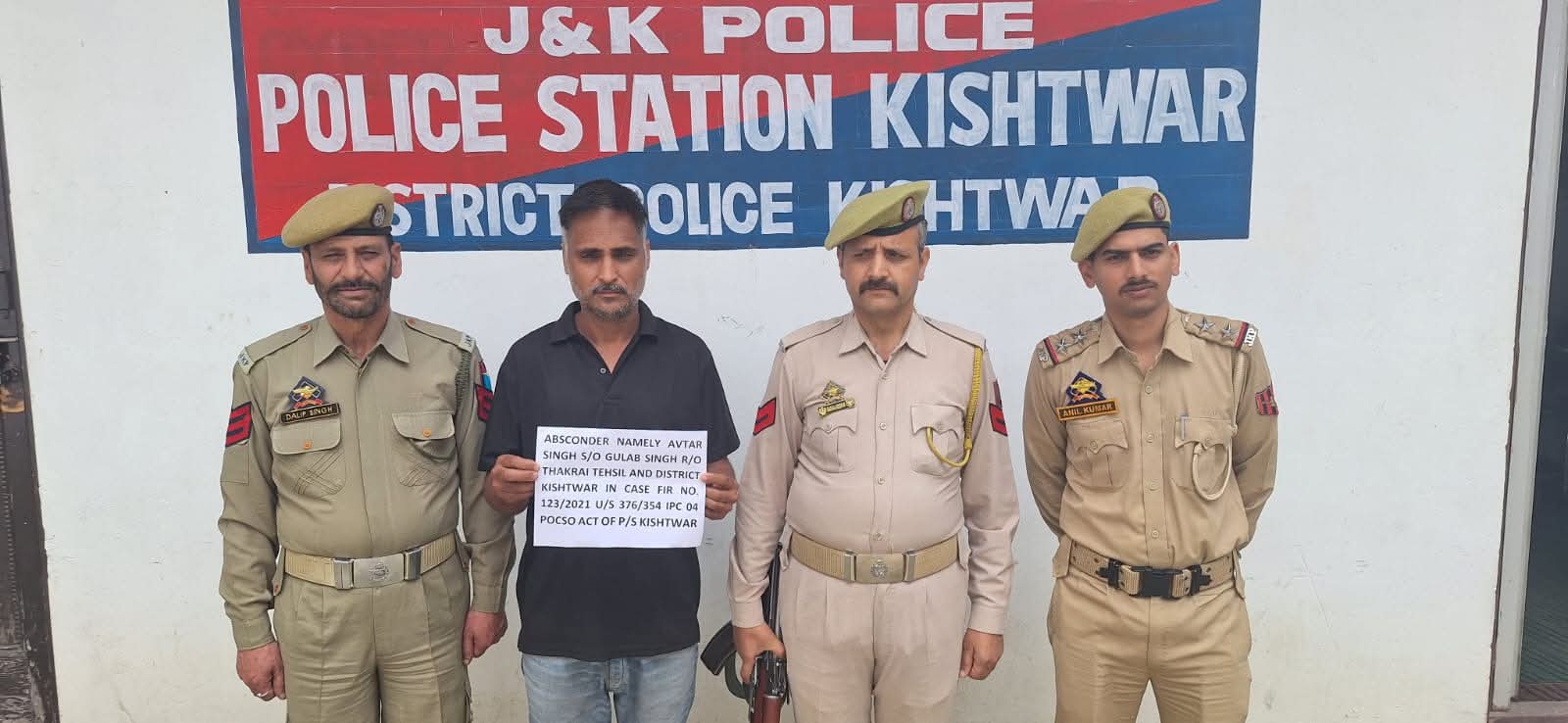 The accused has been identified as Avtar Singh S/o Gulab Singh R/o Thakrai, Tehsil and District Kishtwar, who was wanted in connection with FIR No. 123/2021 registered under sections 376/354 IPC and relevant provisions of the POCSO Act at Police Station Kishtwar. He had been evading arrest since 2021.