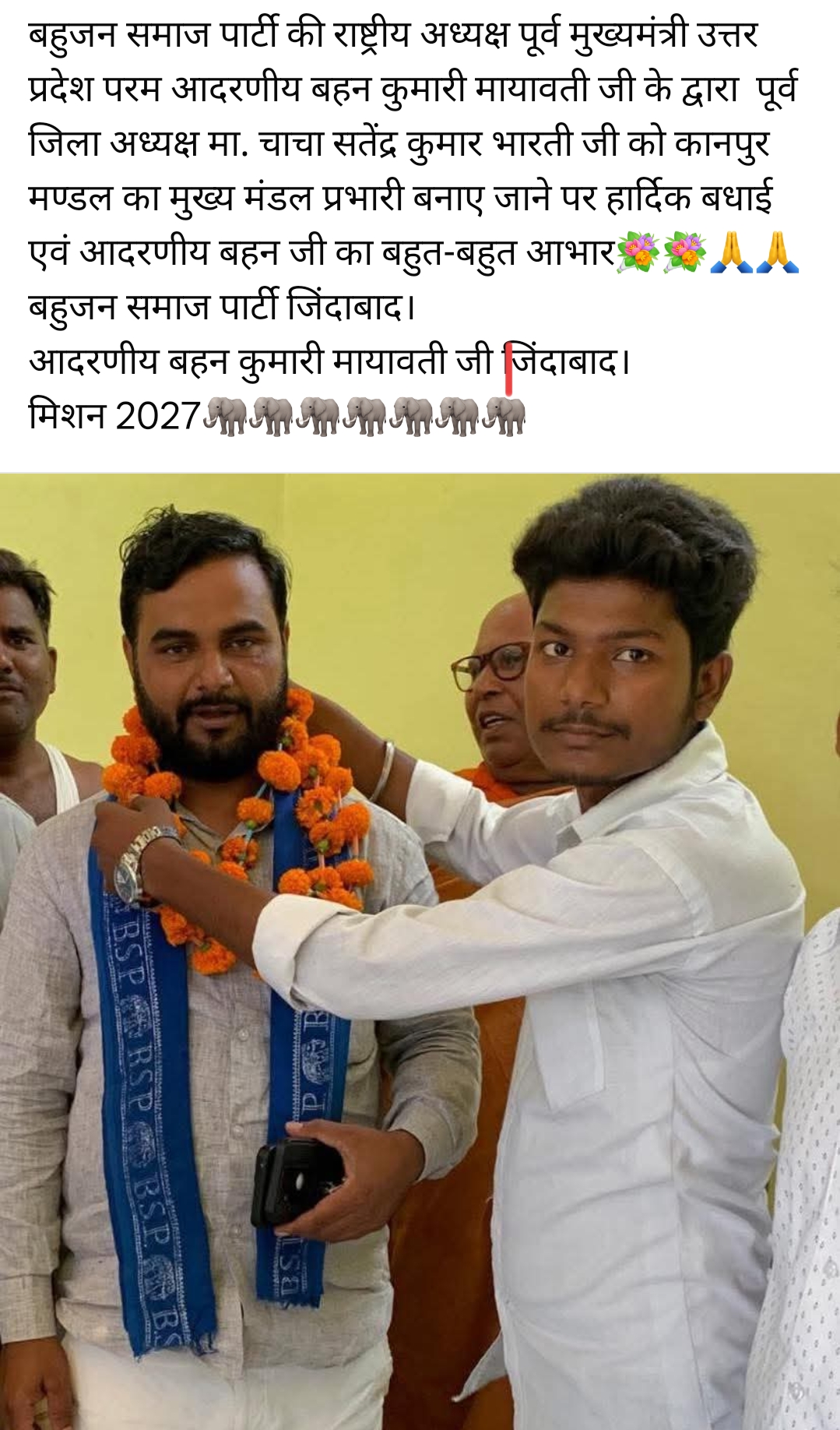 कन्नौज। बहुजन समाज पार्टी में संगठन को मजबूत करने के उद्देश्य से एक महत्वपूर्ण निर्णय लिया गया है। माननीय राष्ट्रीय अध्यक्ष एवं उत्तर प्रदेश की पूर्व मुख्यमंत्री कुमारी मायावती जी के निर्देश पर कन्नौज के पूर्व जिला अध्यक्ष मा. सतेन्द्र कुमार भारती को एक बार फिर से कानपुर मंडल का मुख्य प्रभारी नियुक्त किया गया है।