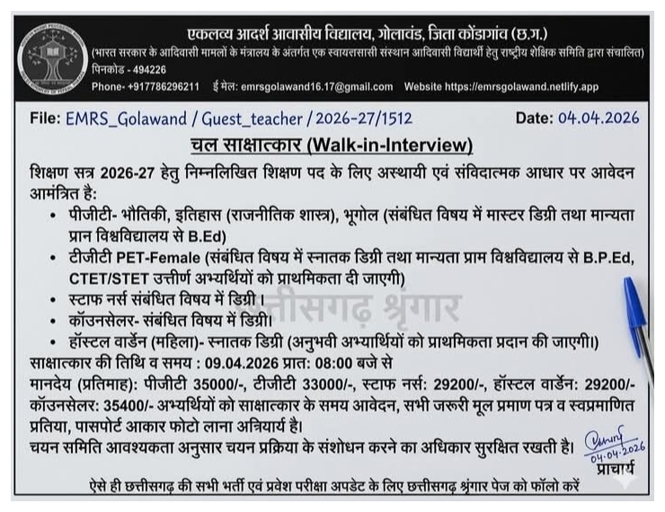 рдПрдХрд▓рд╡реНрдп рдЖрджрд░реНрд╢ рдЖрд╡рд╛рд╕реАрдп рд╡рд┐рджреНрдпрд╛рд▓рдп (EMRS), рдЧреЛрд▓рд╛рд╡рдВрдб, рдЬрд┐рд▓рд╛ рдХреЛрдВрдбрд╛рдЧрд╛рдВрд╡ (рдЫ.рдЧ.) рдореЗрдВ рд╢рд┐рдХреНрд╖рдг рд╕рддреНрд░ 2026-27 рдХреЗ рд▓рд┐рдП рд╡рд┐рднрд┐рдиреНрди рдкрджреЛрдВ рдкрд░ рдЕрд╕реНрдерд╛рдИ/рд╕рдВрд╡рд┐рджрд╛ рдХреЗ рдЖрдзрд╛рд░ рдкрд░ рд╡реЙрдХ-рдЗрди-рдЗрдВрдЯрд░рд╡реНрдпреВ (Walk-in-Interview) рдХрд╛ рдЖрдпреЛрдЬрди рдХрд┐рдпрд╛ рдЬрд╛ рд░рд╣рд╛ рд╣реИред рдЕрдЧрд░ рдЖрдк рдпрд╛ рдЖрдкрдХреЗ рдкрд░рд┐рдЪрд┐рдд рд╢рд┐рдХреНрд╖рд╛ рдФрд░ рд╕реНрд╡рд╛рд╕реНрдереНрдп рдХреНрд╖реЗрддреНрд░ рдореЗрдВ рдЕрд╡рд╕рд░ рддрд▓рд╛рд╢ рд░рд╣реЗ рд╣реИрдВ, рддреЛ рдпрд╣ рдПрдХ рдмреЗрд╣рддрд░реАрди рдореМрдХрд╛ рд╣реИ!