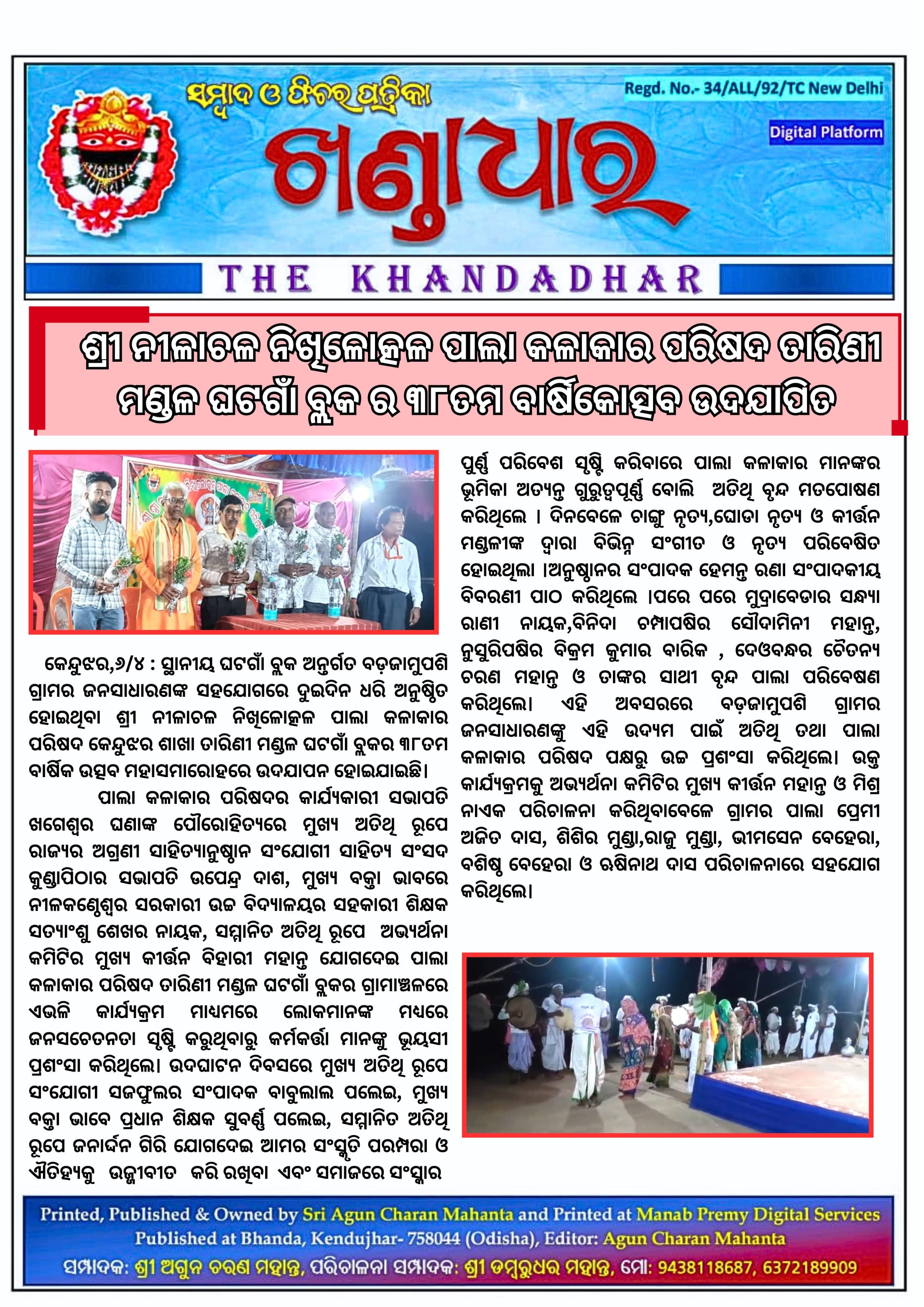 ଘଟଗାଁ ବ୍ଲକ ଅନ୍ତର୍ଗତ ବଡ଼ଜାମୁପଶି ଗ୍ରାମରେ ଶ୍ରୀ ନୀଳାଚଳ ନିଖିଳୋତ୍କଳ ପାଲା କଳାକାର ପରିଷଦ, କେନ୍ଦୁଝର ଶାଖା ତାରିଣୀ ମଣ୍ଡଳ ଘଟଗାଁ ବ୍ଲକର ବାର୍ଷିକ ଉତ୍ସବ ସମାପନ