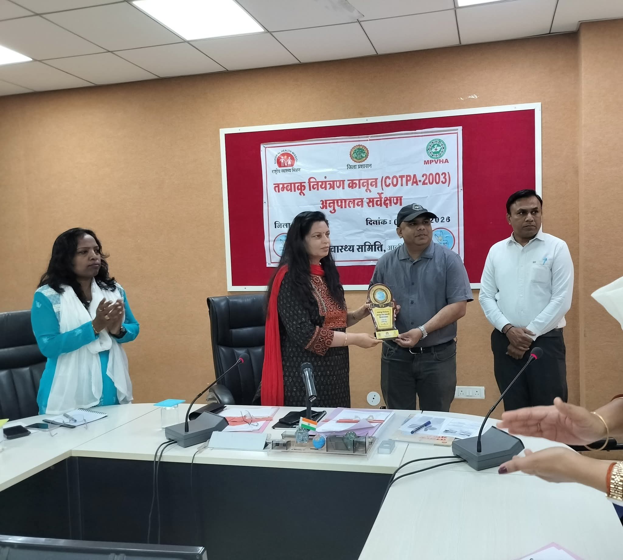 कलेक्टर श्रीमती नीतू माथुर की अध्यक्षता में कलेक्ट्रेट सभा कक्ष में तंबाकू नियंत्रण कार्यक्रम की समीक्षा बैठक आयोजित की गई। बैठक में तंबाकू नियंत्रण कार्यक्रम के अधिकारी द्वारा बताया कि स्वास्थ्य विभाग को नोडल एजेंसी बनाकर जिले में तंबाकू नियंत्रण अधिनियम 2003 की धारा 4, 5, 6 एवं 7 के प्रभावी क्रियान्वयन हेतु प्रशासन, पुलिस, स्वास्थ्य विभाग एवं मध्य प्रदेश वॉलंटरी हेल्थ एसोसिएशन द्वारा संयुक्त प्रयास किए जा रहे हैं। जिले के 6 विकासखंडों में सार्वजनिक स्थानों और तंबाकू उत्पाद बेचने वाली दुकानों पर अनुपालन सर्वेक्षण कराया गया, जिसमें 664 सार्वजनिक संस्थानों और 183 दुकानों का निरीक्षण किया गया। सर्वेक्षण में धूम्रपान निषेध, विज्ञापन प्रतिबंध,नाबालिगों को बिक्री रोकने तथा स्वास्थ्य चेतावनियों की उपलब्धता जैसे मानकों का आकलन किया गया। परिणामों में अधिकांश बिंदुओं पर उच्च स्तर का अनुपालन पाया गया। विशेष रूप से सार्वजनिक स्थानों पर धूम्रपान निषेध, विज्ञापन प्रतिबंध और चित्रात्मक स्वास्थ्य चेतावनियों की उपस्थिति संतोषजनक रही। इंदौर स्कूल ऑफ सोशल वर्क द्वारा किए गए इस मूल्यांकन में आलीराजपुर जिले ने 80 प्रतिशत से अधिक अंक प्राप्त कर तंबाकू नियंत्रण कानून की धाराओं के पालन के अनुरूप पाया गया। जिले की इस उपलब्धि पर कलेक्टर श्रीमती नीतू माथुर को मोमेंटो प्रदान कर सम्मानित किया गया।