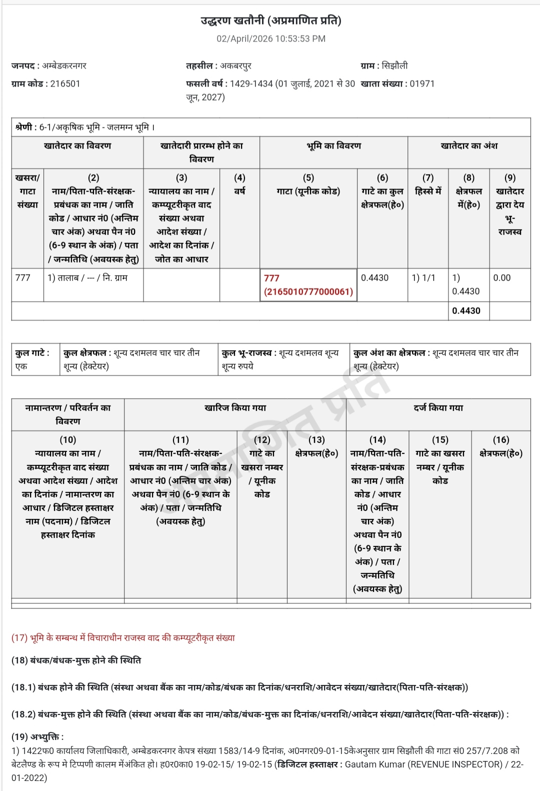 अकबरपुर तहसील अंतर्गत ग्राम सिझोली में सरकारी जमीन पर खुलेआम कब्जे का सनसनीखेज मामला सामने आया है। गाटा संख्या 777, जो सरकारी अभिलेखों में तालाब खाते में दर्ज है, अब भूमाफियाओं की लालच की भेंट चढ़ता नजर आ रहा है।