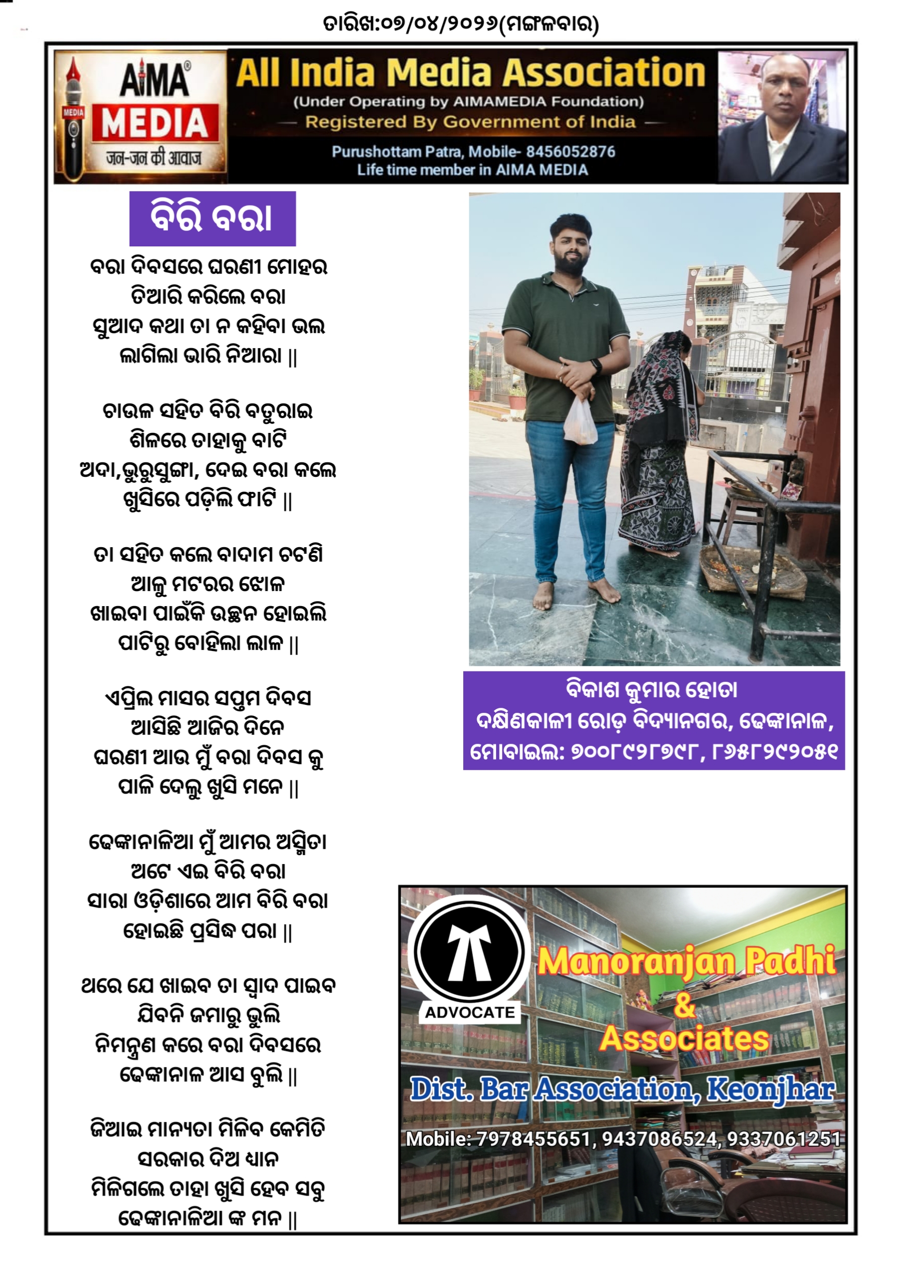 ବିକାଶ କୁମାର ହୋତା, ଦକ୍ଷିଣକାଳୀ ରୋଡ଼ ବିଦ୍ୟାନଗର, ଢେଙ୍କାନାଳ, ମୋବାଇଲ: ୭୦୦୮୯୨୮୭୯୮, ୮୬୫୮୨୯୨୦୫୧