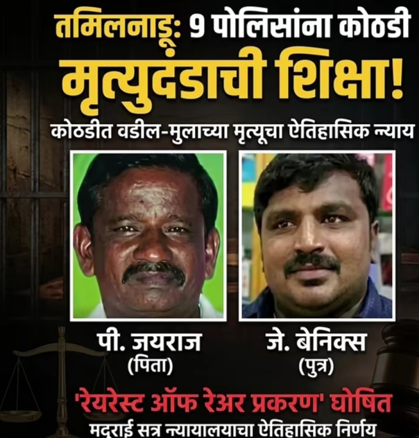 २०२० च्या कुप्रसिद्ध साथनकुलम कोठडीतील हत्या प्रकरणात एक मोठा आणि महत्त्वपूर्ण निकाल देण्यात आला आहे. मद्रास उच्च न्यायालयाच्या मदुराई खंडपीठाने या प्रकरणात दोषी आढळलेल्या तामिळनाडूच्या नऊ पोलिसांना मृत्युदंडाची शिक्षा सुनावली आहे. न्यायालयाने ही घटना 'अतिशय दुर्मिळ' मानून ही कठोर शिक्षा ठोठावली आहे. सहा वर्षांच्या खटल्यानंतर हा निकाल देण्यात आला. या प्रकरणाची सुनावणी प्रथम अतिरिक्त जिल्हा आणि सत्र न्यायाधीश जी. मुथुकुमारन यांच्यासमोर झाली, ज्यांनी सर्व नऊ आरोपींना खून आणि इतर संबंधित आरोपांखाली दोषी ठरवले.