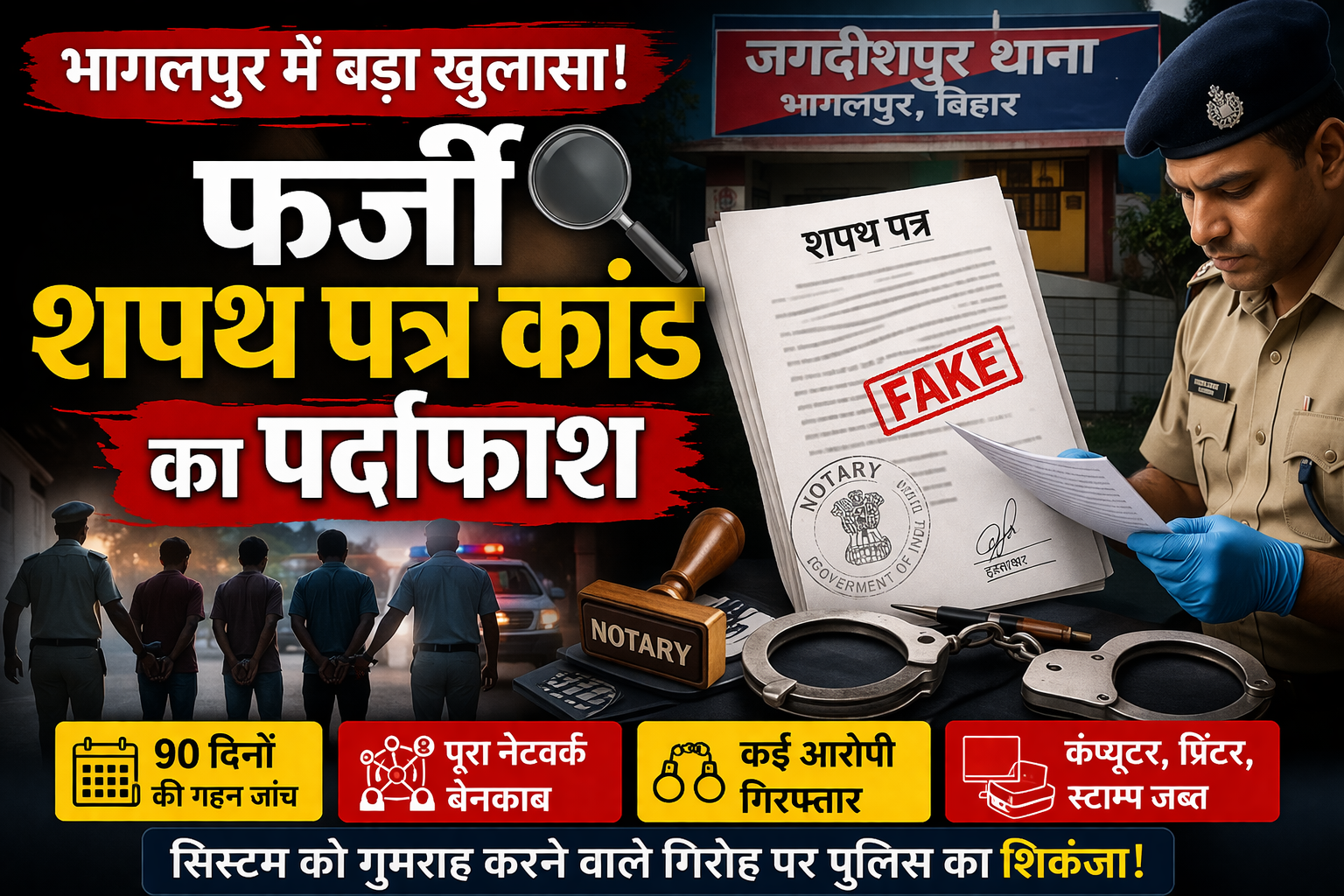 рднрд╛рдЧрд▓рдкреБрд░ рдЬрд┐рд▓реЗ рдХреЗ рдЬрдЧрджреАрд╢рдкреБрд░ рдерд╛рдирд╛ рдХреНрд╖реЗрддреНрд░ рдореЗрдВ рдЪрд▓ рд░рд╣реЗ рдЪрд░реНрдЪрд┐рдд рдлрд░реНрдЬреА рд╢рдкрде рдкрддреНрд░ рдХрд╛рдВрдб рдХрд╛ рдкреБрд▓рд┐рд╕ рдиреЗ рд╕рдирд╕рдиреАрдЦреЗрдЬ рдкрд░реНрджрд╛рдлрд╛рд╢ рдХрд┐рдпрд╛ рд╣реИред рдХрд░реАрдм 90 рджрд┐рдиреЛрдВ рдХреА рд▓рдВрдмреА рдФрд░ рддрдХрдиреАрдХреА рдЬрд╛рдВрдЪ рдХреЗ рдмрд╛рдж рдЗрд╕ рд╣рд╛рдИ-рдкреНрд░реЛрдлрд╛рдЗрд▓ рдорд╛рдорд▓реЗ рдореЗрдВ рдкреВрд░реЗ рдиреЗрдЯрд╡рд░реНрдХ рдХреЛ рдЙрдЬрд╛рдЧрд░ рдХрд░ рджрд┐рдпрд╛ рдЧрдпрд╛ рд╣реИред