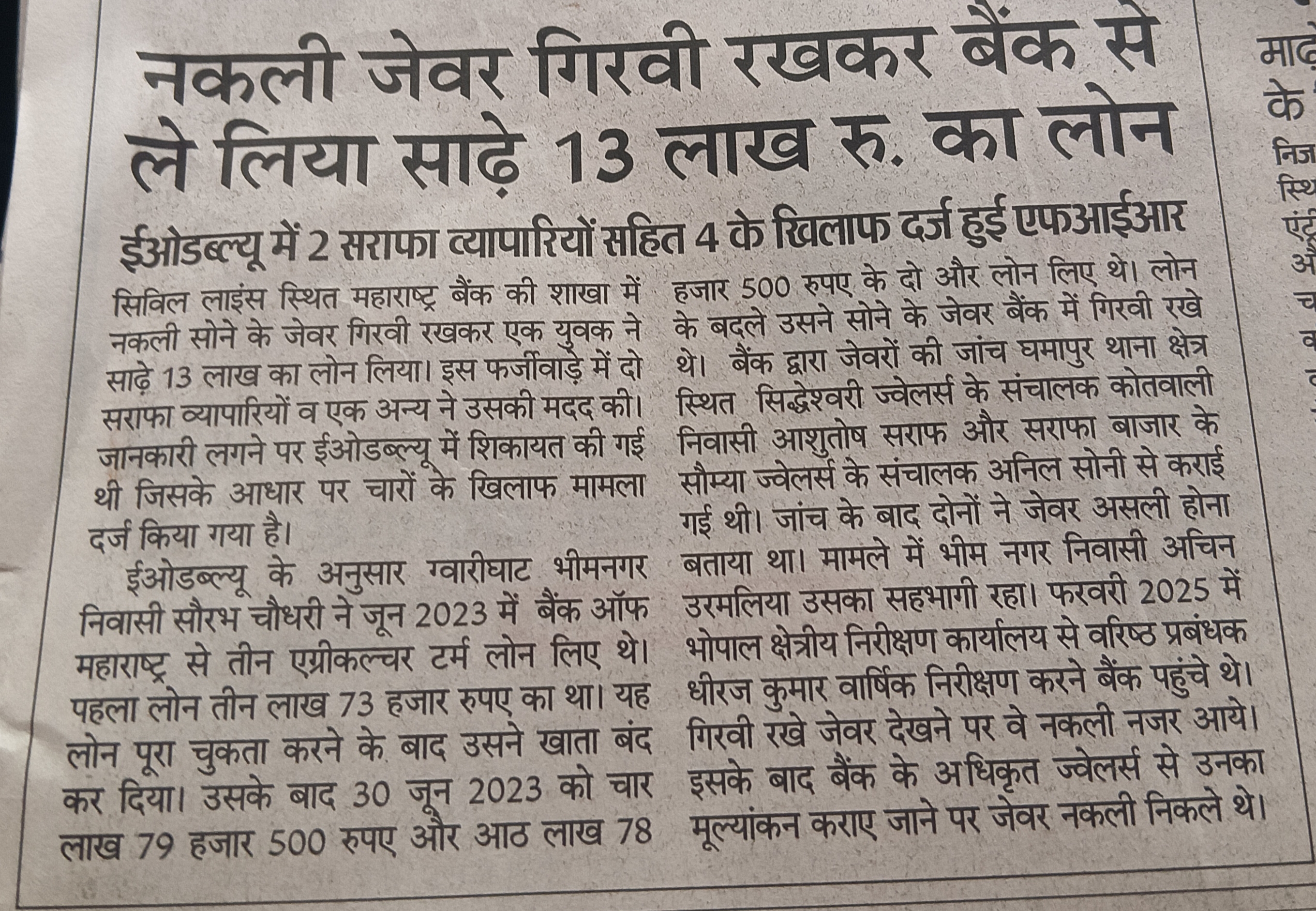 नकली जेवर गिरवी रखकर बैंक से ले लिया साढ़े 13 लाख रू का लोन