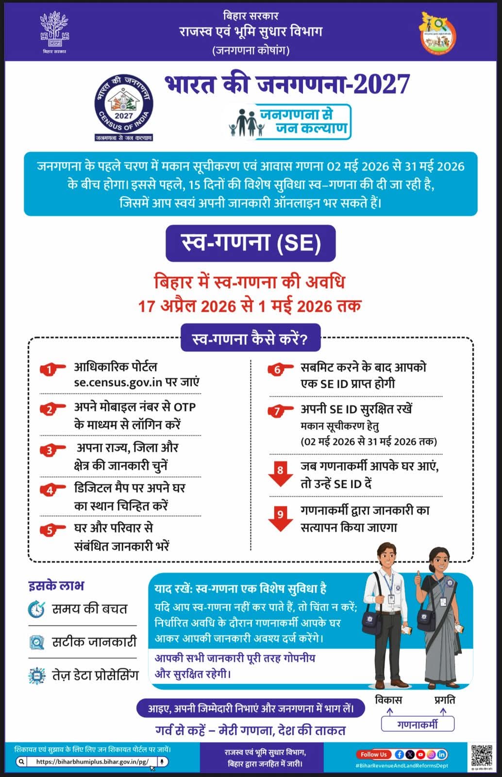 स्व–गणना पोर्टल के माध्यम से 17 अप्रैल से 01 मई के बीच यह सुविधा प्रदान की जाएगी।