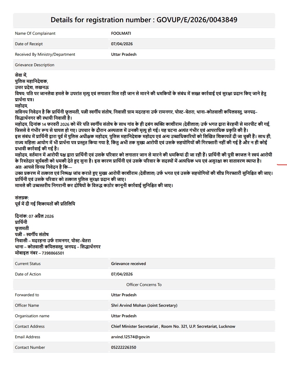 पीड़िता फूलमती ने अपनी नई शिकायत (पंजीकरण संख्या: GOVUP/E/2026/0043849) में चौंकाने वाला खुलासा किया है। पीड़िता का आरोप है कि: