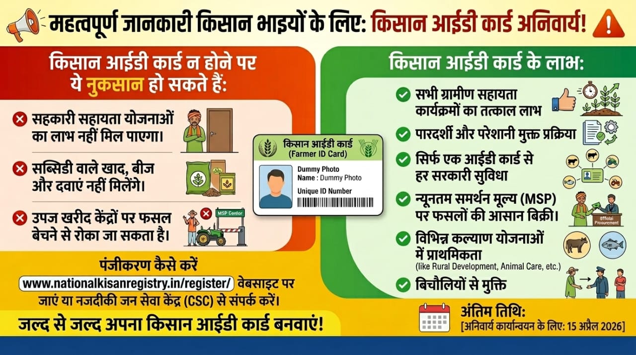 рд╕рд░рдХрд╛рд░ рдХрд╛ рдХрд╣рдирд╛ рд╣реИ рдХрд┐ рдЗрд╕ рдлреИрд╕рд▓реЗ рд╕реЗ рдлрд░реНрдЬреА рд▓рд╛рднрд╛рд░реНрдерд┐рдпреЛрдВ рдкрд░ рд░реЛрдХ рд▓рдЧреЗрдЧреА рдФрд░ рд╕рд╣реА рдХрд┐рд╕рд╛рдиреЛрдВ рддрдХ рдпреЛрдЬрдирд╛рдУрдВ рдХрд╛ рд▓рд╛рдн рд╕реАрдзреЗ рдкрд╣реБрдВрдЪреЗрдЧрд╛ред рд╣рд╛рд▓рд╛рдВрдХрд┐, рдЬрд┐рди рдХрд┐рд╕рд╛рдиреЛрдВ рдХреЗ рдкрд╛рд╕ рдЕрднреА рддрдХ рдХрд┐рд╕рд╛рди рдЖрдИрдбреА рдирд╣реАрдВ рд╣реИ, рдЙрдиреНрд╣реЗрдВ 15 рдЕрдкреНрд░реИрд▓ 2026 рд╕реЗ рдкрд╣рд▓реЗ рд╣реА рдмрдирд╡рд╛рдиреЗ рдХреА рд╕рд▓рд╛рд╣ рджреА рдЧрдИ рд╣реИ, рддрд╛рдХрд┐ рдмрд╛рдж рдореЗрдВ рдХрд┐рд╕реА рднреА рдкреНрд░рдХрд╛рд░ рдХреА рдкрд░реЗрд╢рд╛рдиреА рди рд╣реЛред