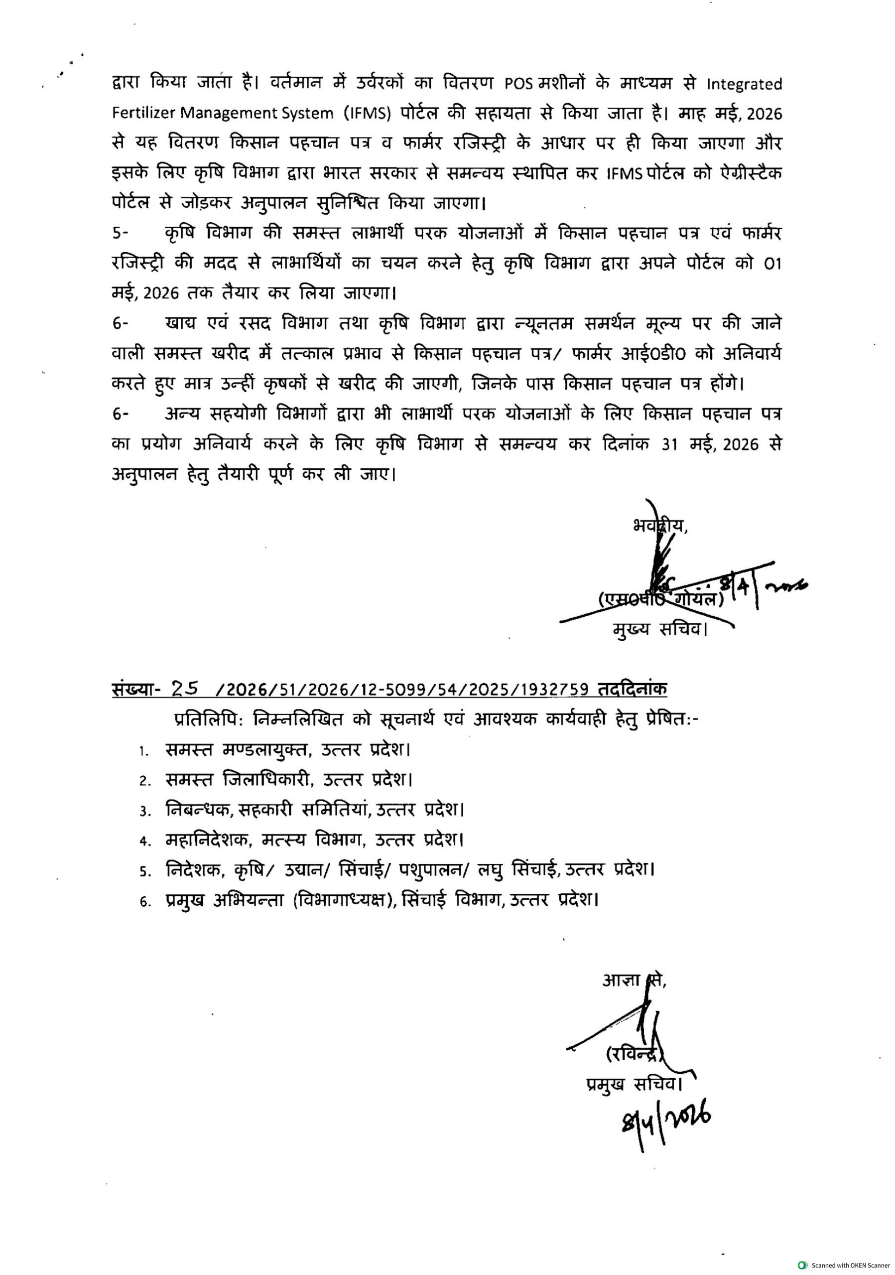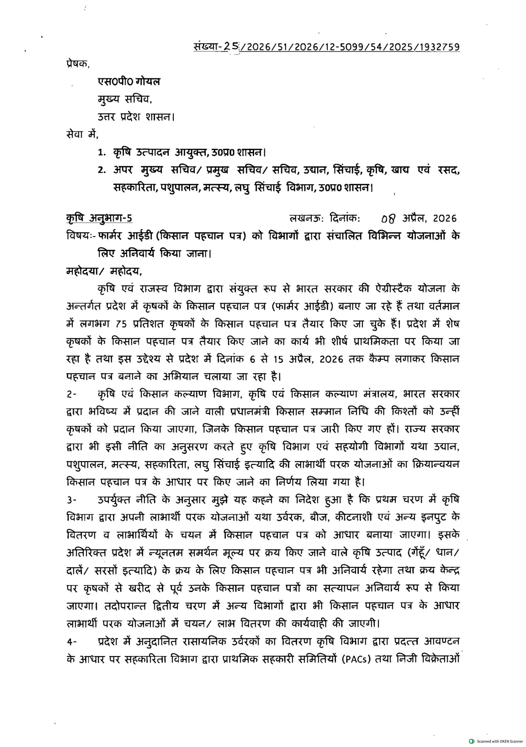 рдХреГрд╖рд┐ рд╡рд┐рднрд╛рдЧ 1 рдордИ 2026 рддрдХ рдЕрдкрдирд╛ рдкреЛрд░реНрдЯрд▓ рддреИрдпрд╛рд░ рдХрд░ рд▓реЗрдЧрд╛, рдЬрд┐рд╕рд╕реЗ рд╕рднреА рдпреЛрдЬрдирд╛рдУрдВ рдореЗрдВ рдХрд┐рд╕рд╛рдиреЛрдВ рдХрд╛ рдЪрдпрди рдХрд┐рд╕рд╛рди рдЖрдИрдбреА рдХреЗ рдЖрдзрд╛рд░ рдкрд░ рдХрд┐рдпрд╛ рдЬрд╛рдПрдЧрд╛ред рд╡рд╣реАрдВ 31 рдордИ 2026 рддрдХ рдЕрдиреНрдп рд╡рд┐рднрд╛рдЧреЛрдВ рдХреЛ рднреА рдЗрд╕реЗ рд▓рд╛рдЧреВ рдХрд░рдиреЗ рдХреЗ рдирд┐рд░реНрджреЗрд╢ рджрд┐рдП рдЧрдП рд╣реИрдВред