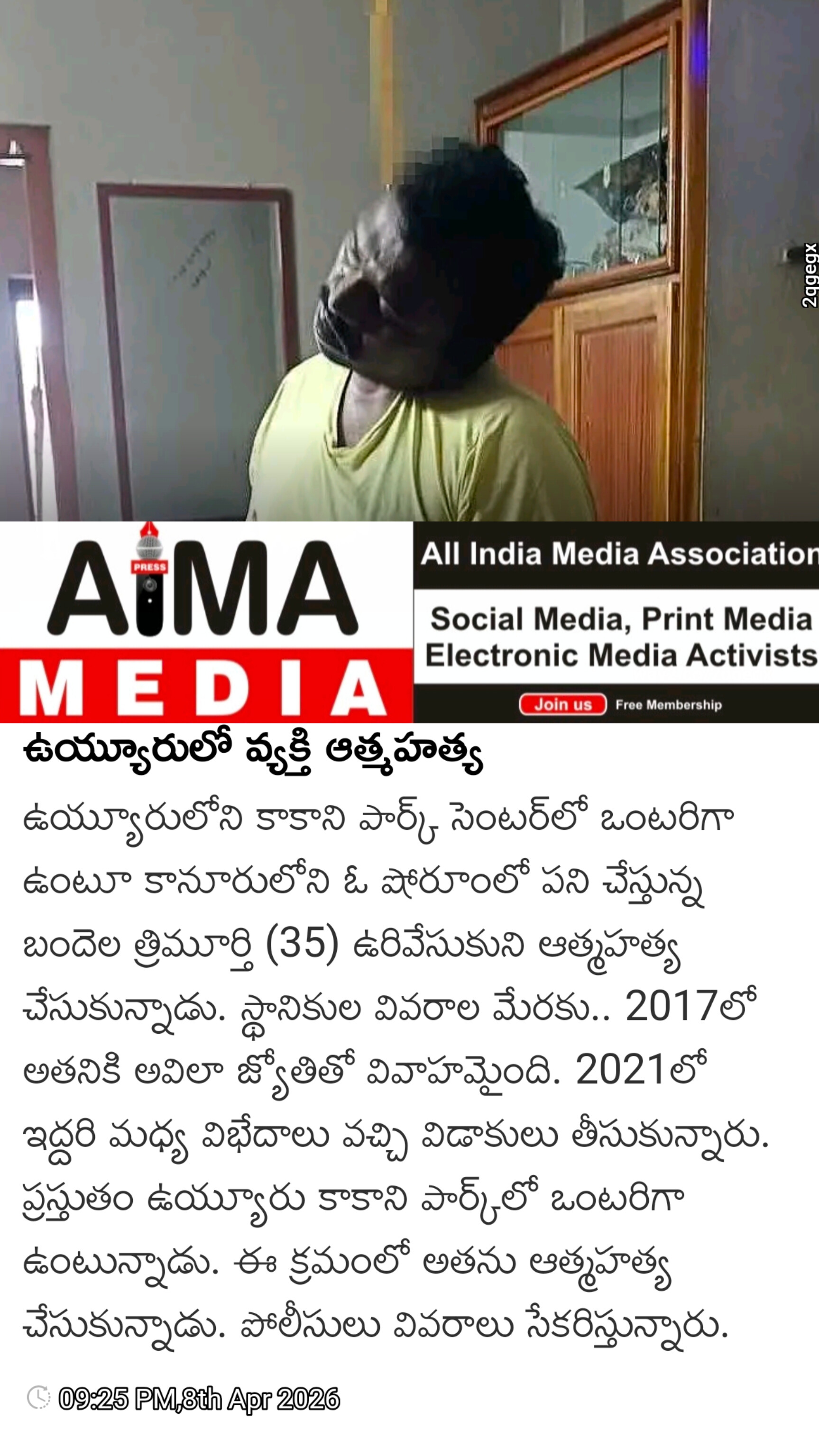 ఉయ్యూరులోని కాకాని పార్క్ సెంటర్లో ఒంటరిగా ఉంటూ కానూరులోని ఓ షోరూంలో పని చేస్తున్న బందెల త్రిమూర్తి (35) ఉరివేసుకుని ఆత్మహత్య చేసుకున్నాడు. స్థానికుల వివరాల మేరకు.. 2017లో అతనికి అవిలా జ్యోతితో వివాహమైంది. 2021లో ఇద్దరి మధ్య విభేదాలు వచ్చి విడాకులు తీసుకున్నారు. ప్రస్తుతం ఉయ్యూరు కాకాని పార్క్లో ఒంటరిగా ఉంటున్నాడు. ఈ క్రమంలో అతను ఆత్మహత్య చేసుకున్నాడు. పోలీసులు వివరాలు సేకరిస్తున్నారు.