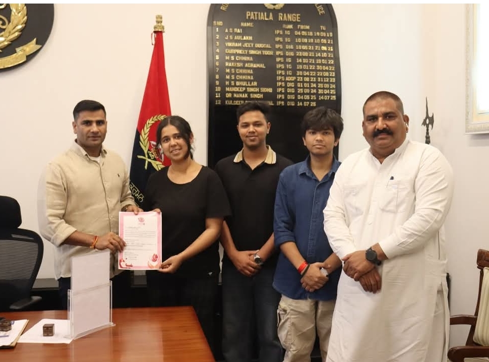 ਡੀ ਆਈ ਜੀ ਪਟਿਆਲਾ ਰੇਂਜ ਕੁਲਦੀਪ ਸਿੰਘ ਚਾਹਲ ਜੀ ਨੂੰ ਥਾਪਰ ਇੰਸਟੀਚਿਊਟ ਆਫ ਟੈਕਨਾਲੋਜੀ ਦੇ ਰੋਟਰੈਕਟ ਕਲੱਬ ਵੱਲੋਂ ਲਗਾਏ ਜਾ ਰਹੇ ਖੂਨਦਾਨ ਕੈਂਪ ਮਿਤੀ 16/4/26 ਦਾ ਸੱਦਾ ਪੱਤਰ ਦਿੰਦੇ ਹੋਏ ਸਟੇਟ ਐਵਾਰਡੀ ਪਰਮਿੰਦਰ ਭਲਵਾਨ ਮੈਂਬਰ ਨਸ਼ਾ ਮੁਕਤ ਭਾਰਤ ਅਭਿਆਨ, ਰੋਟਰੈਕਟ ਕਲੱਬ ਤੋਂ ਅਰਮਾਨ ਮਲਿਕ,ਸਨੇਹਾ ਬਰਨਾਵਲ, ਸ਼ੇਖਰ ਚੋਰਸੀਆ