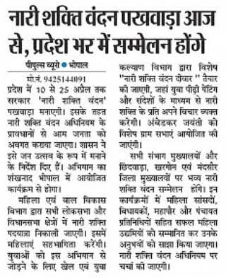 10 अप्रैल से 25 अप्रैल तक प्रदेशव्यापी "नारी शक्ति वंदन" पखवाड़ा